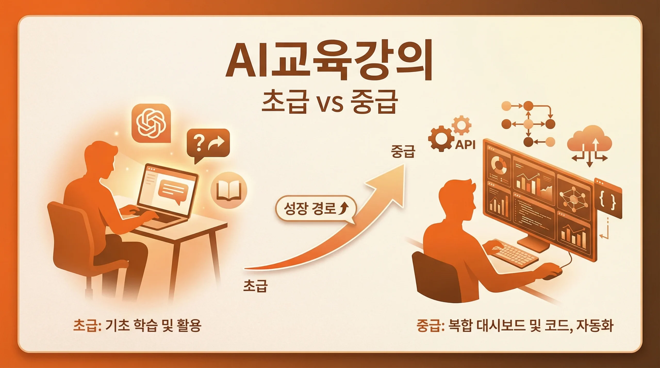 초급은 AI 도구 사용법과 프롬프트 작성에 집중하고, 중급은 API 연동, 업무 자동화 설계, 프로젝트 기반 실습으로 확장됩니다. 초급은 AI를 ‘사용하는 법’, 중급은 AI를 ‘확장하고 재가공하는 법’을 배우는 단계입니다.