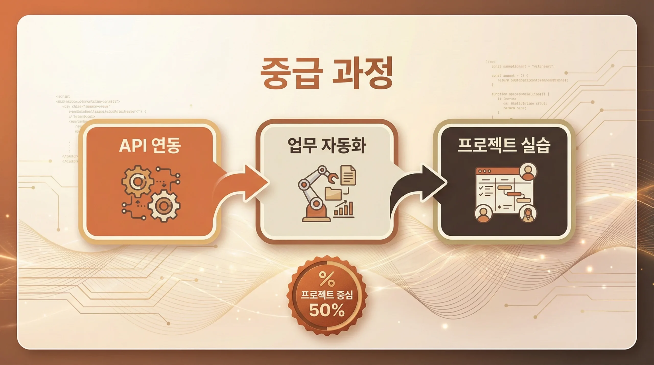 가능합니다. 중급 과정은 코딩 중심의 개발자 트랙과 노코드/로우코드 기반의 비개발자 트랙으로 나뉩니다. 마케터는 AI 이미지 생성과 자동 모니터링을, 기획자는 문서 분석 자동화와 리서치 자동화를 배울 수 있습니다.