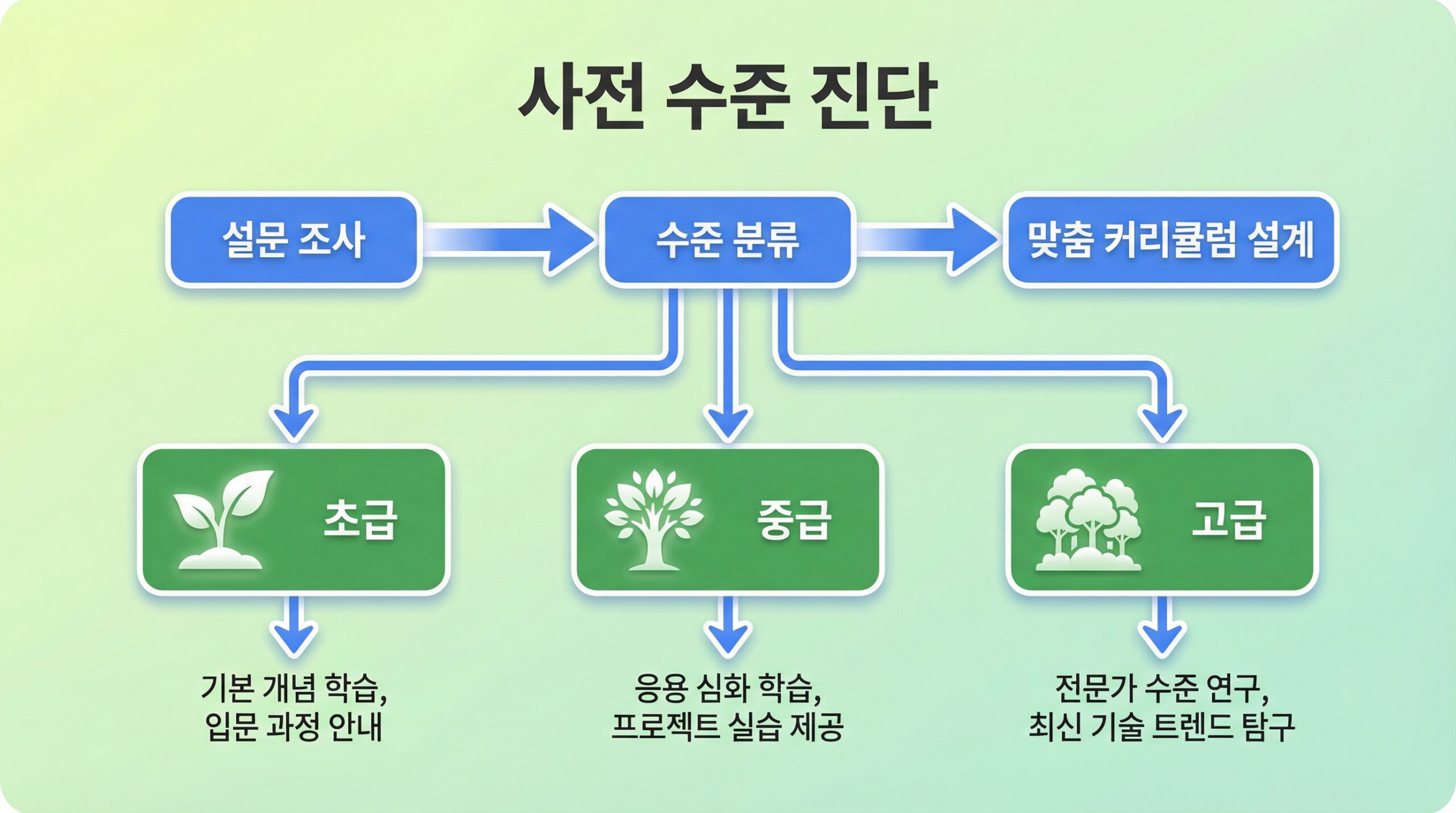 | 수준 미파악 | 초급자와 고급자를 같은 반에 배치 | 초급자는 포기, 고급자는 지루함 |