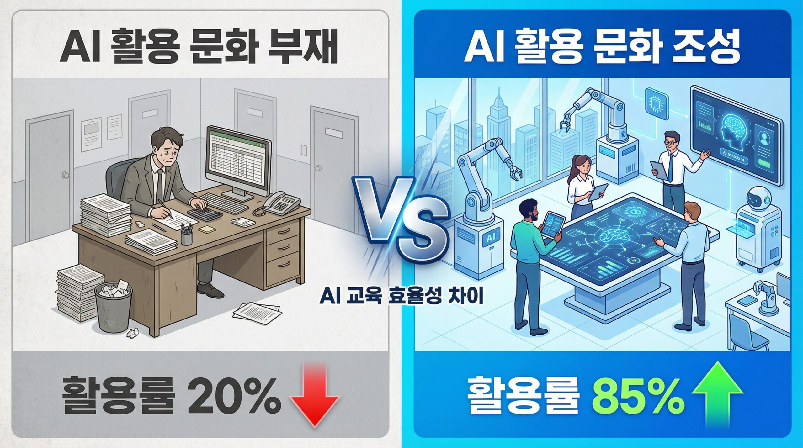 교육 내용이 아무리 좋아도, 조직 문화가 AI 활용을 지지하지 않으면 직원들은 교육장을 나서는 순간 이전 방식으로 돌아갑니다. AI교육 성공의 네 번째 조건은 조직 전체가 AI를 자연스럽게 활용하는 문화를 만드는 것입니다.