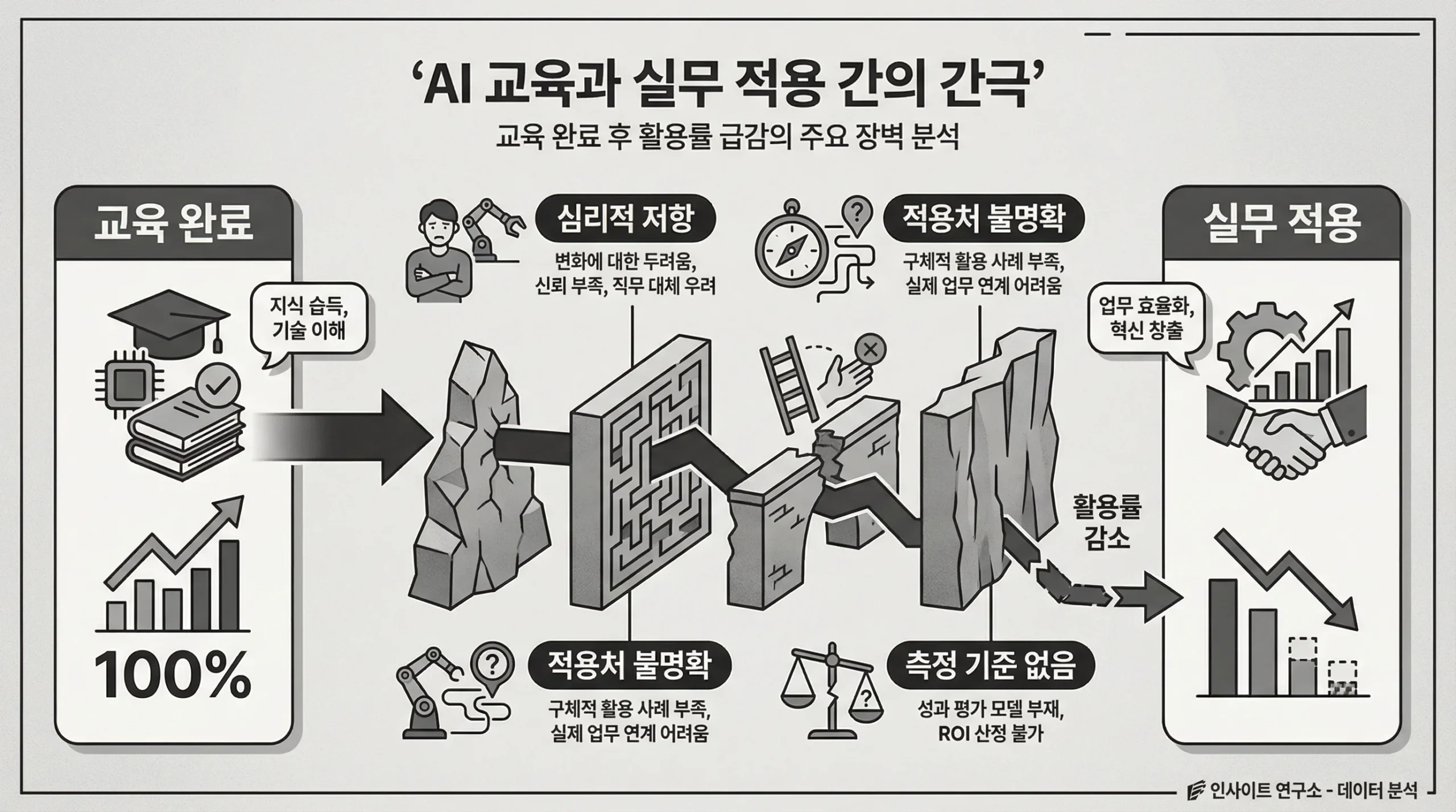 교육을 받은 직원의 74%가 한 달 뒤 AI 도구를 사용하지 않게 됩니다. 기술 부족이 원인이 아닙니다. 실제 적용 과정에서 겪는 구조적 장벽 때문입니다.