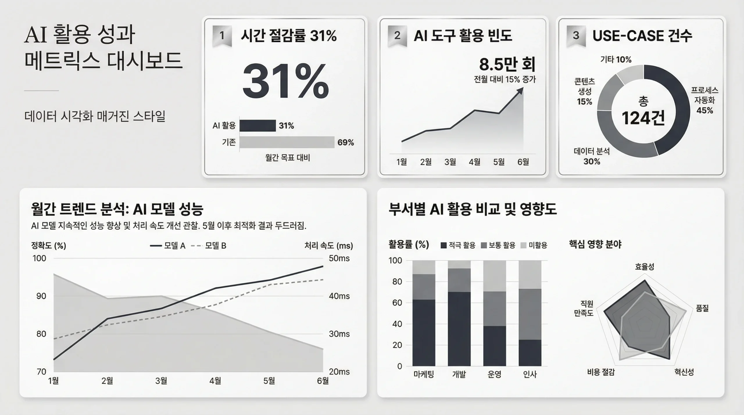 - AI 도구 활용 빈도: ChatGPT Team, 기관별 AI 도입 플랫폼의 로그인 횟수와 대화 건수를 추적합니다.
