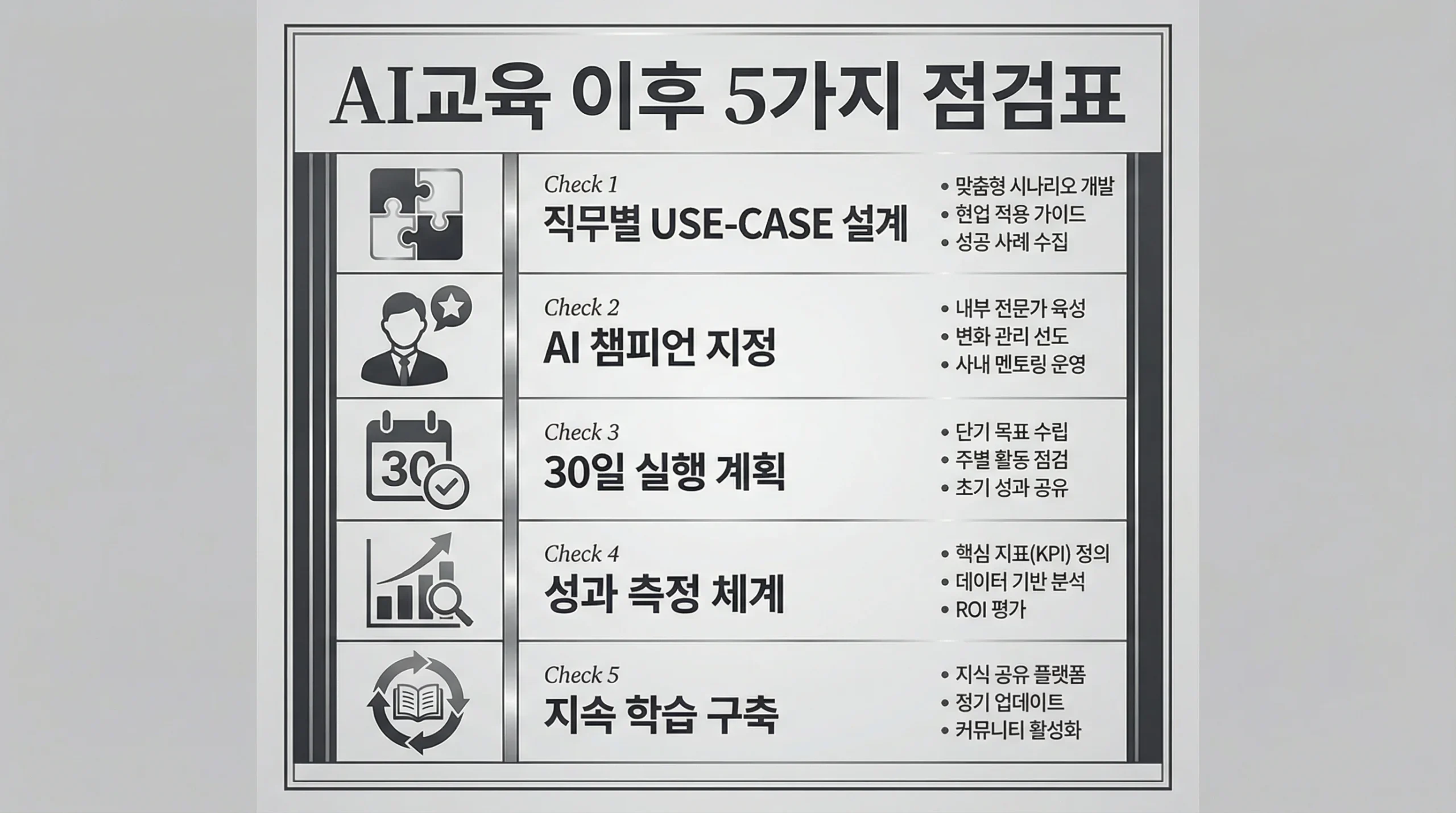 AI교육은 출발선이지, 결승선이 아닙니다. USE-CASE 설계, AI 챔피언 지정, 30일 실행 계획, 성과 측정, 지속 학습이라는 5가지 체크포인트를 통과해야 교육 투자가 실제 조직 성과로 이어집니다.