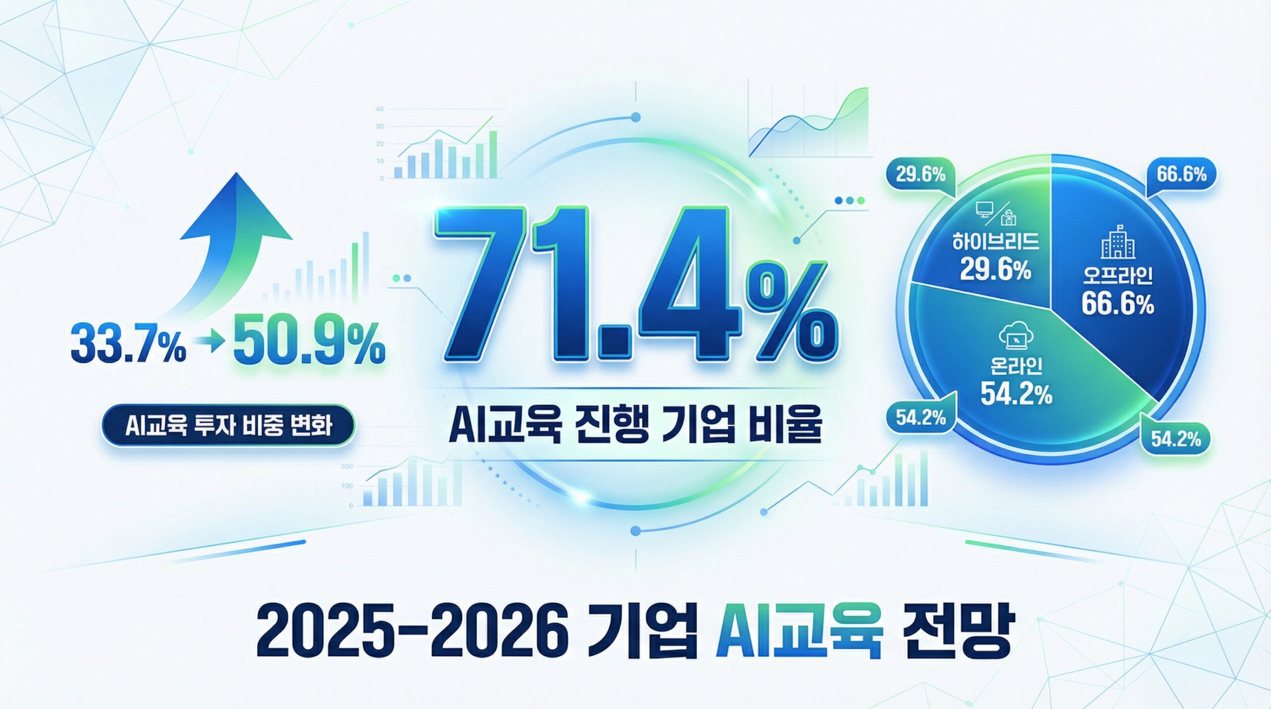 기업 AI교육 시장은 폭발적으로 성장하고 있습니다. 2025년 기준으로 AI 교육을 진행한 기업은 전체의 71.4%에 달합니다. 전 직원 대상 교육이 22.1%, 일부 부서 대상 선택 교육이 49.3%를 차지했습니다. 2026년에는 AI 교육을 전년 대비 확대하겠다는 기업이 53.9%로, 축소하겠다는 응답(3.2%)을 압도적으로 넘어섰습니다.