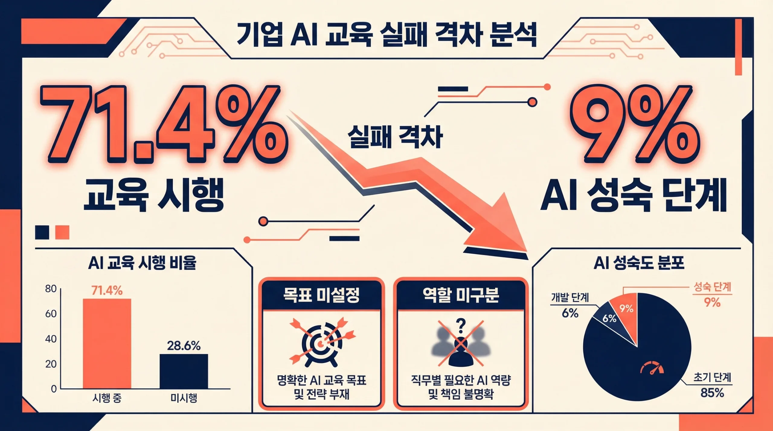 | 비즈니스 목표 부재 | AI 도구 사용법만 교육 | 교육 후 실무 적용률 20% 미만 |