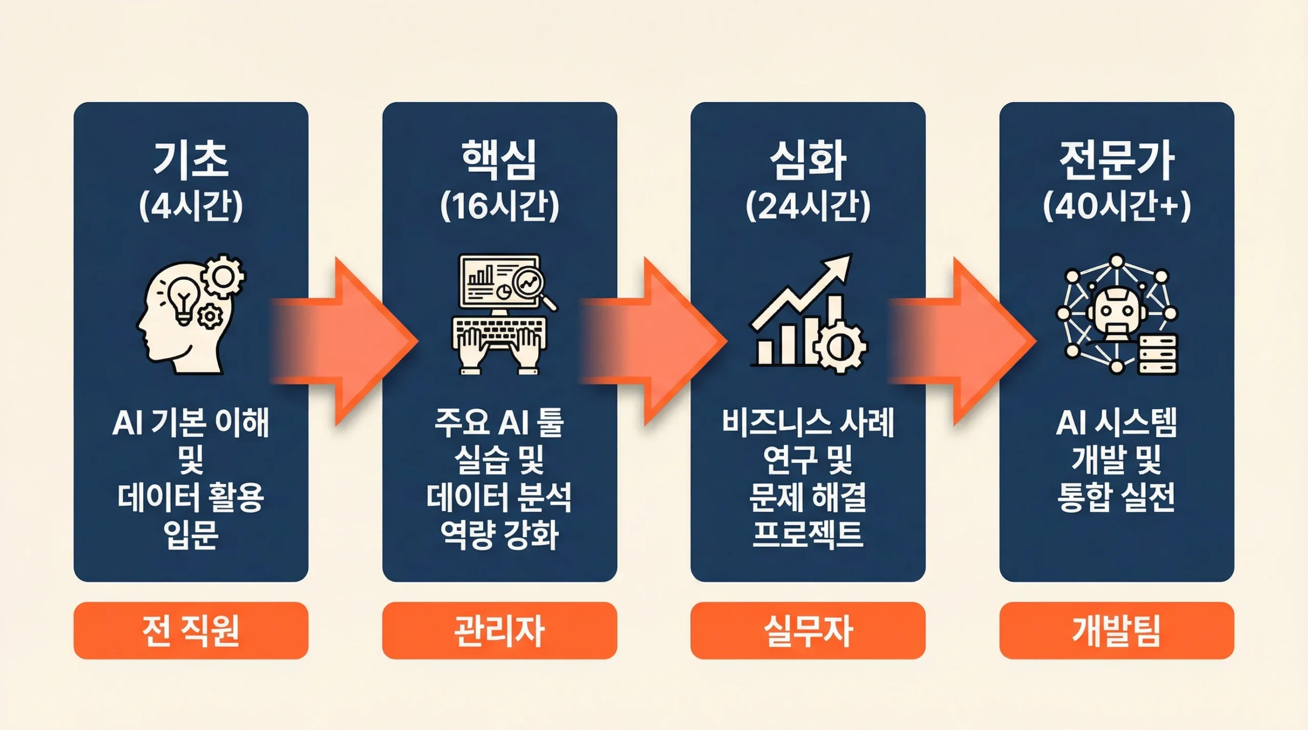 | 중간관리자 | AI 도입 | 팀 업무 AI 적용 설계, 변화 관리, 성과 측정 | 16~24시간 |