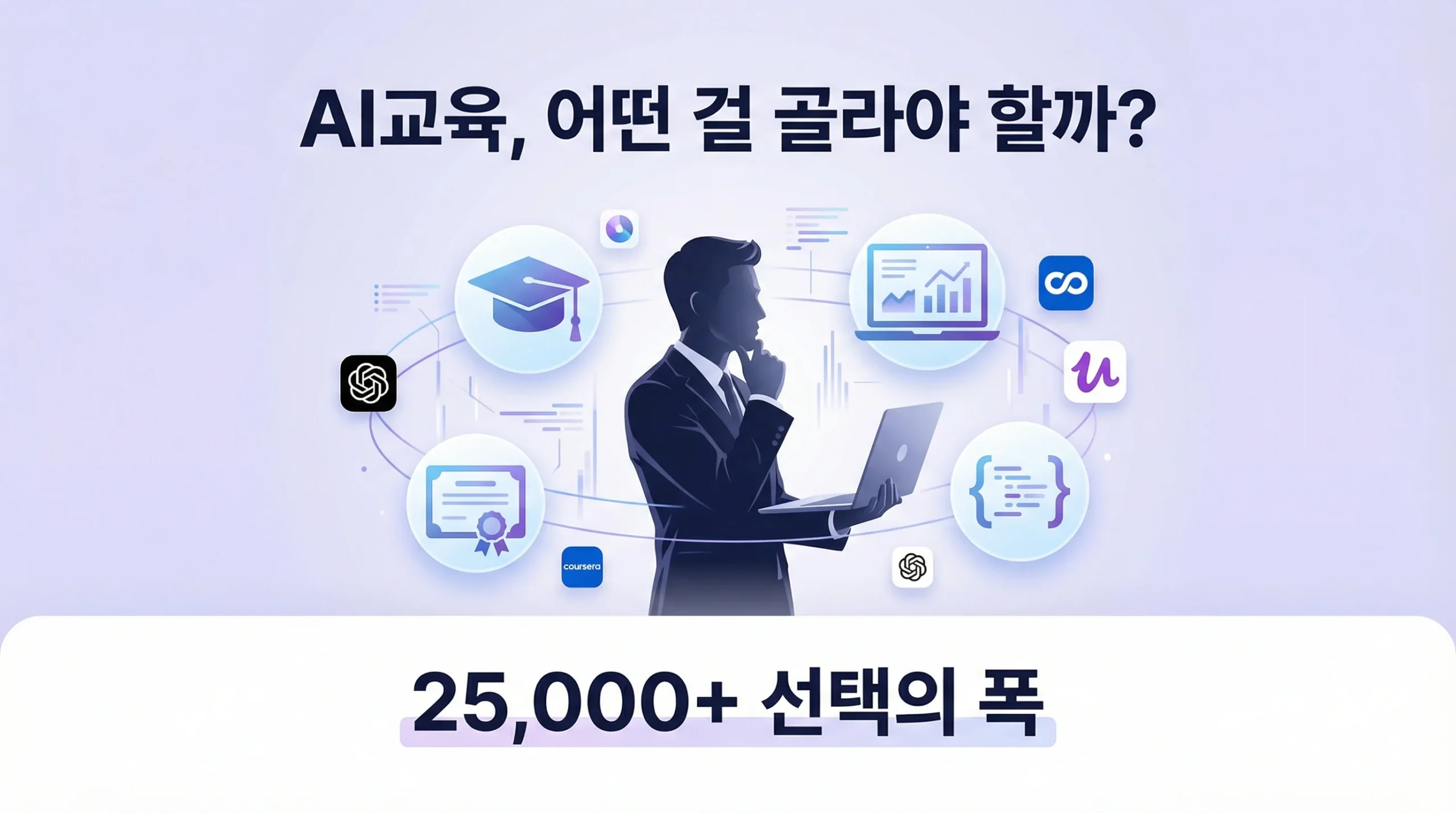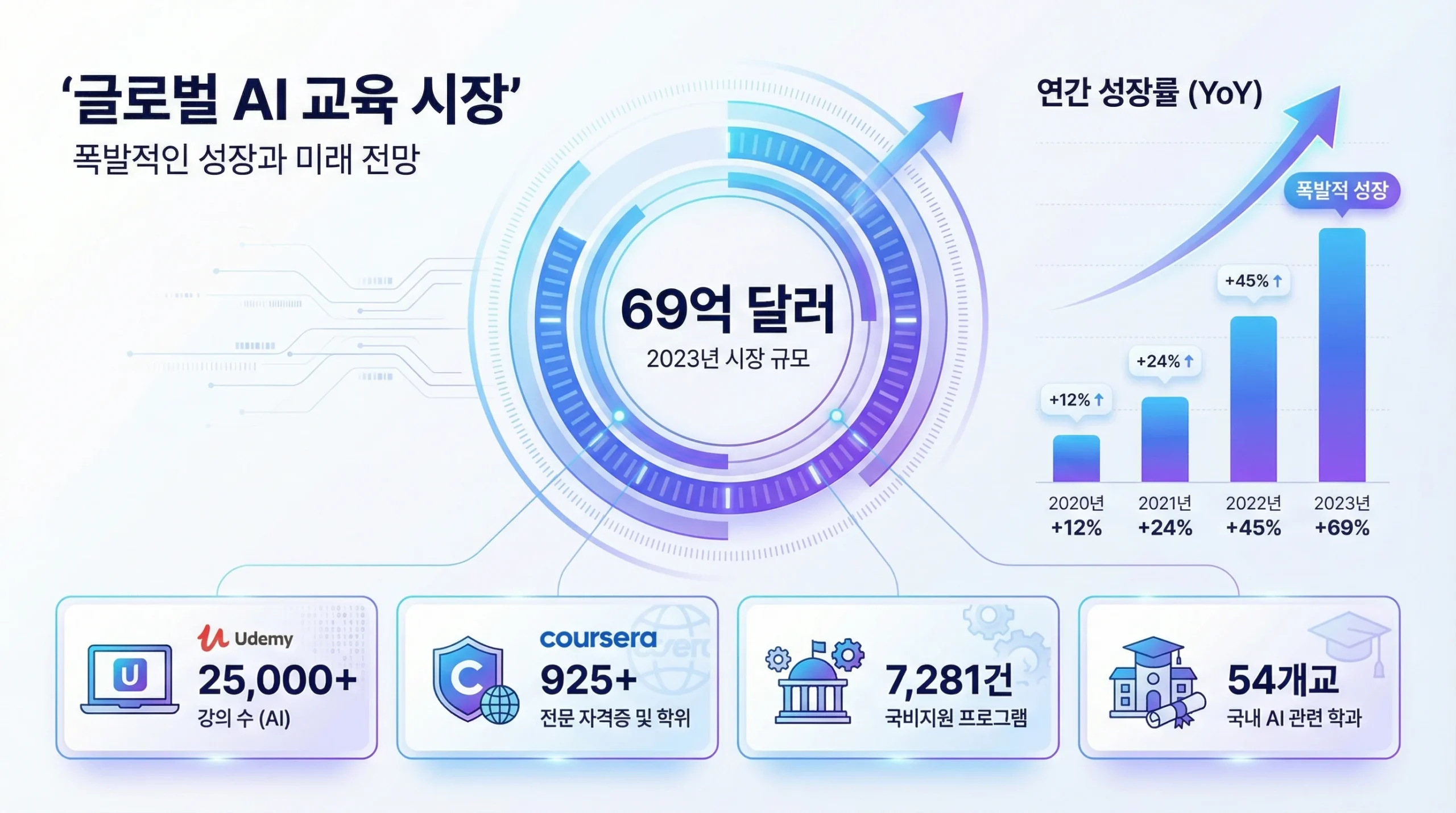 Udemy에만 AI 관련 강좌가 2만 5천 개 이상이고, Coursera 생성형 AI 과정은 925개를 넘었습니다. 한국 내 국비지원 디지털 교육과정만 7,281건, AI 학과를 운영하는 대학도 54개교에 달합니다.