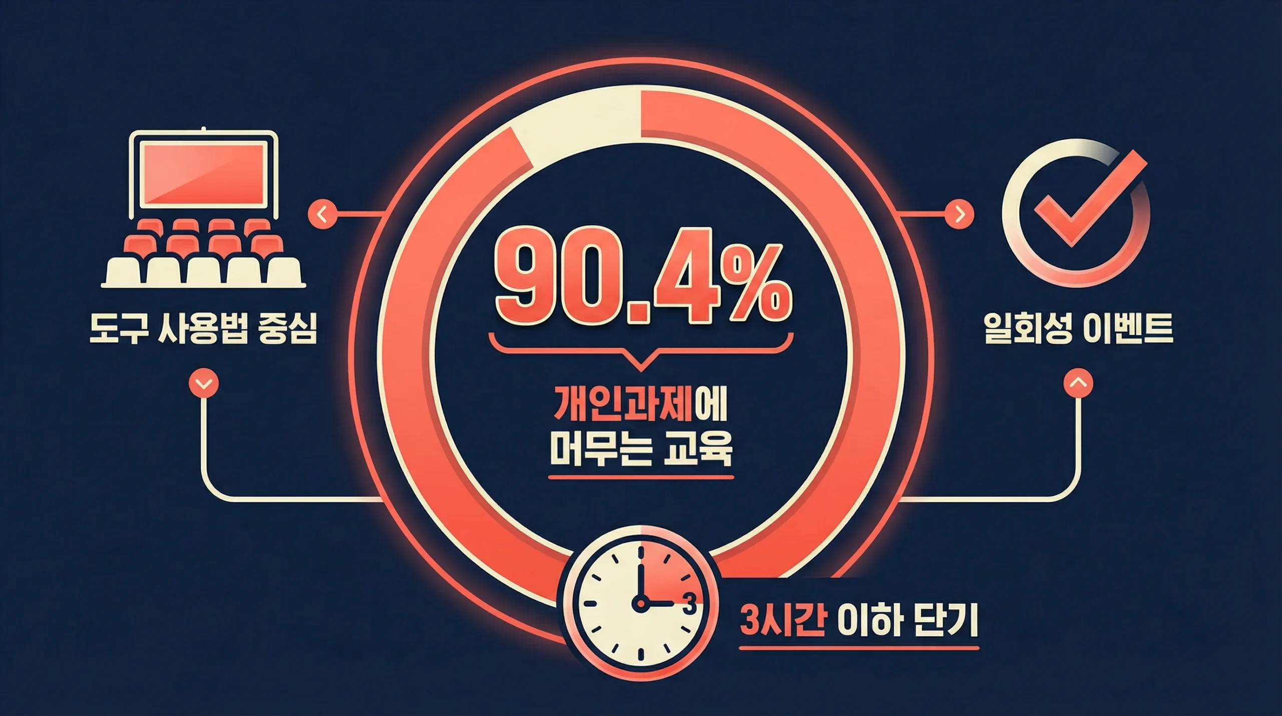 이 격차의 원인을 들여다보면, 교육 방식에 있습니다. 코멘토 HRD 특별포럼(2025)의 분석에 따르면, 기업 AI 교육 유즈케이스의 90.4%가 개인과제 수준에 머물고, 조직 차원의 실제 문제를 해결한 사례는 9.6%에 불과했습니다. 대부분의 교육이 ‘이런 기능이 있습니다’에서 끝나고, ‘이걸로 우리 팀의 이 문제를 풀어봅시다’로 나아가지 못한다는 뜻입니다.