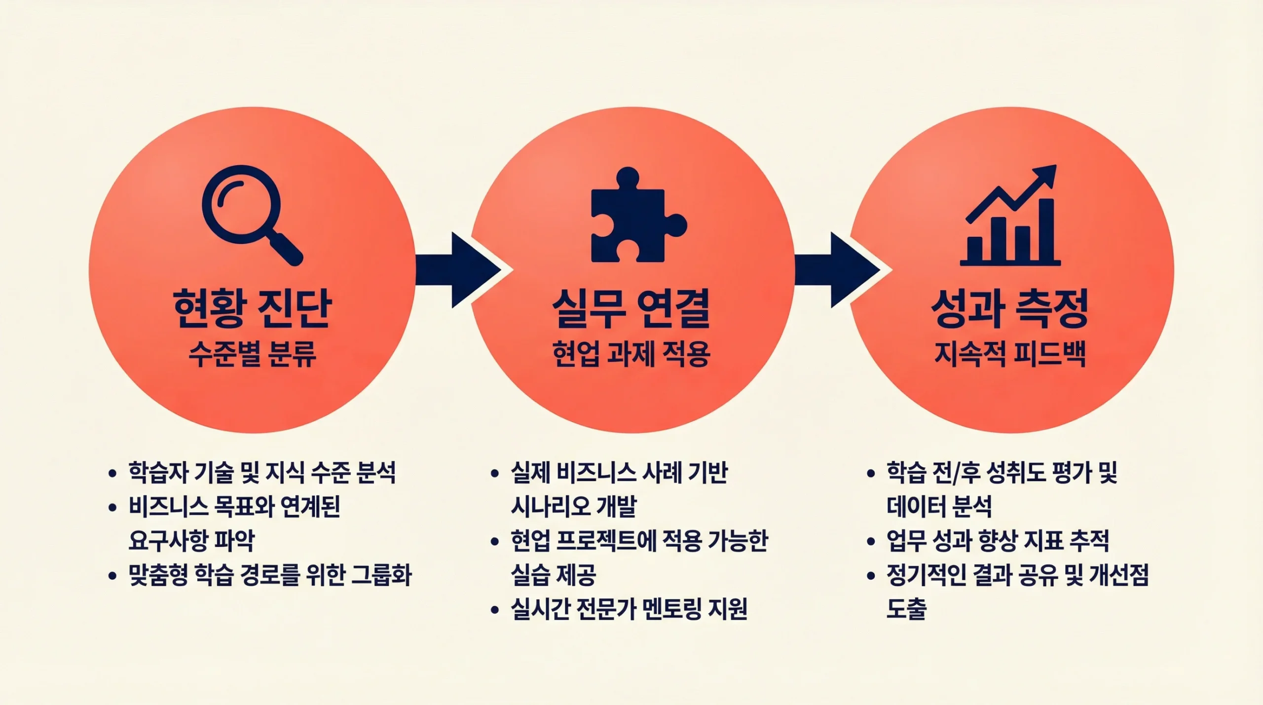 - 성과 측정 및 확대: 교육 전후 업무 효율 변화를 측정하고, 성과가 확인되면 전사로 확대합니다.