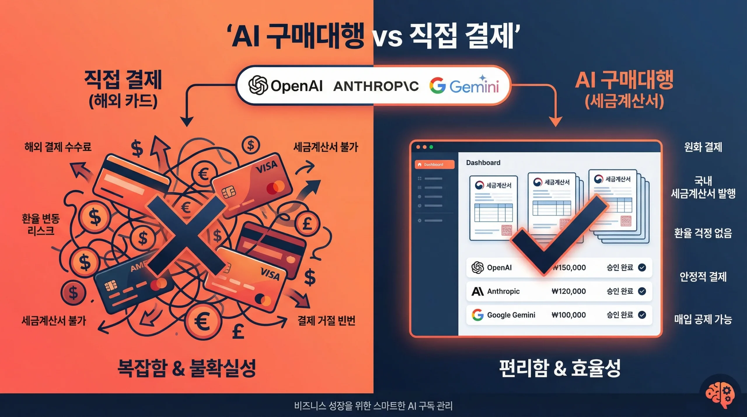 AI 구매대행이 직접 결제보다 정말 나을까요? 결론부터 말하면, 기업 규모와 관계없이 구매대행이 비용·관리·세무 모든 면에서 유리합니다. 2026년 현재 국내 기업의 85%가 생성형 AI 도입을 추진하고 있지만, 상당수가 해외 직접 결제의 불편함과 숨은 비용을 간과한 채 구독을 시작합니다. 이 글에서는 AI 구독 대행 서비스가 직접 결제 방식을 압도하는 구체적인 이유 5가지를 짚어 봅니다.