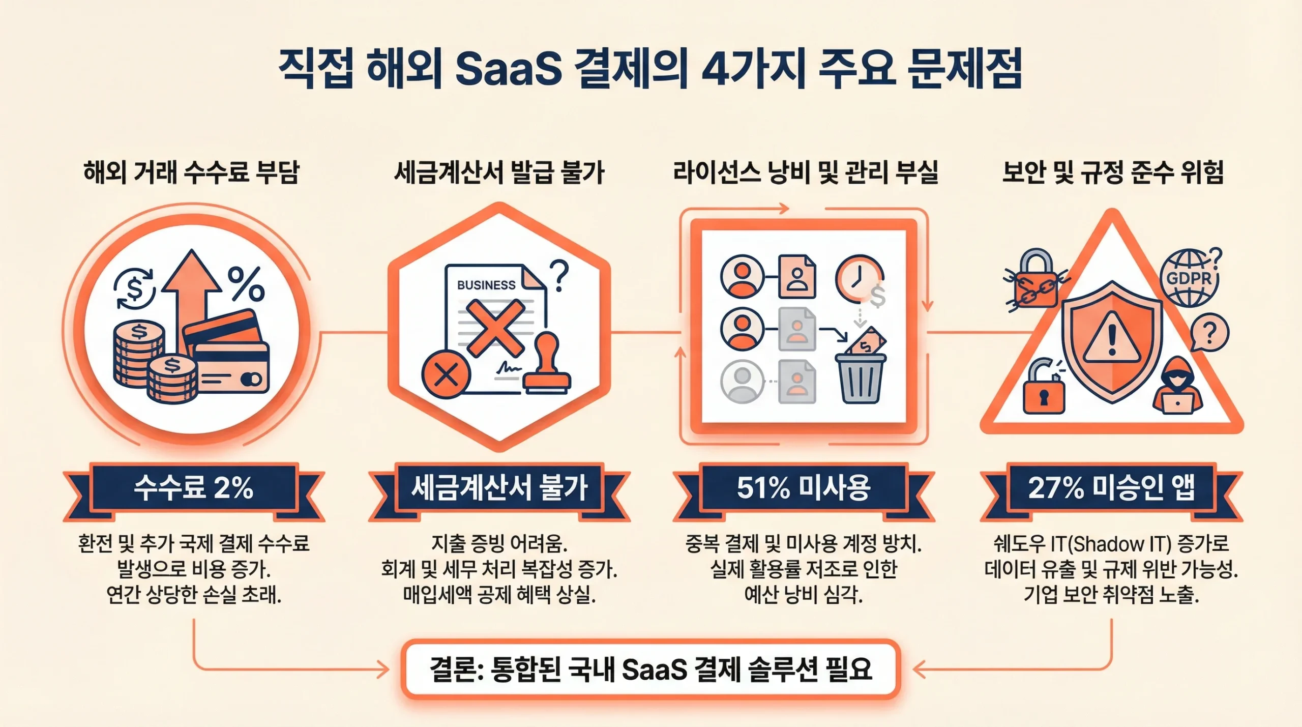 해외 SaaS 직접 결제는 세금계산서가 발행되지 않습니다. 경비 처리를 위해 카드 매출전표, 환율 계산, 부가세 대리납부 신고를 매월 반복해야 합니다. 재무팀 입장에서는 AI 구독 하나 때문에 별도의 세무 프로세스를 운영하는 셈입니다.