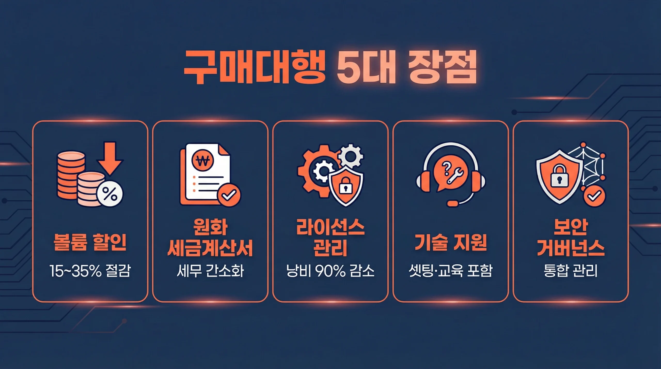 10인 이하라도 세금계산서 발행, 비용 처리 간소화, 기술 지원 측면에서 구매대행이 유리합니다. 볼륨 할인은 규모가 클수록 커지지만, 관리 편의성은 소규모에서도 체감됩니다.