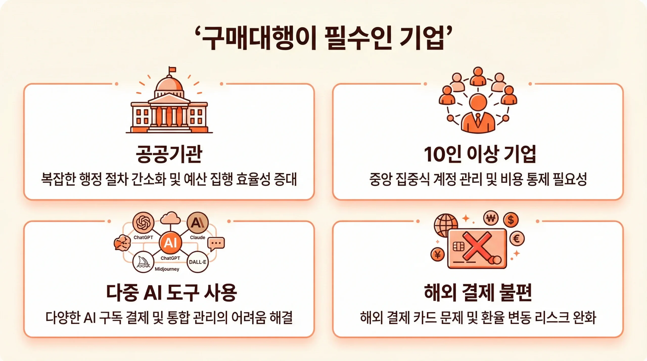 - 다중 AI 도구 사용 조직: ChatGPT, Claude, Gemini, Copilot을 동시에 운영하면 결제·관리·갱신 시점이 모두 다릅니다. 하나의 대행사를 통해 통합 관리하면 운영 부담이 확 줄어듭니다.