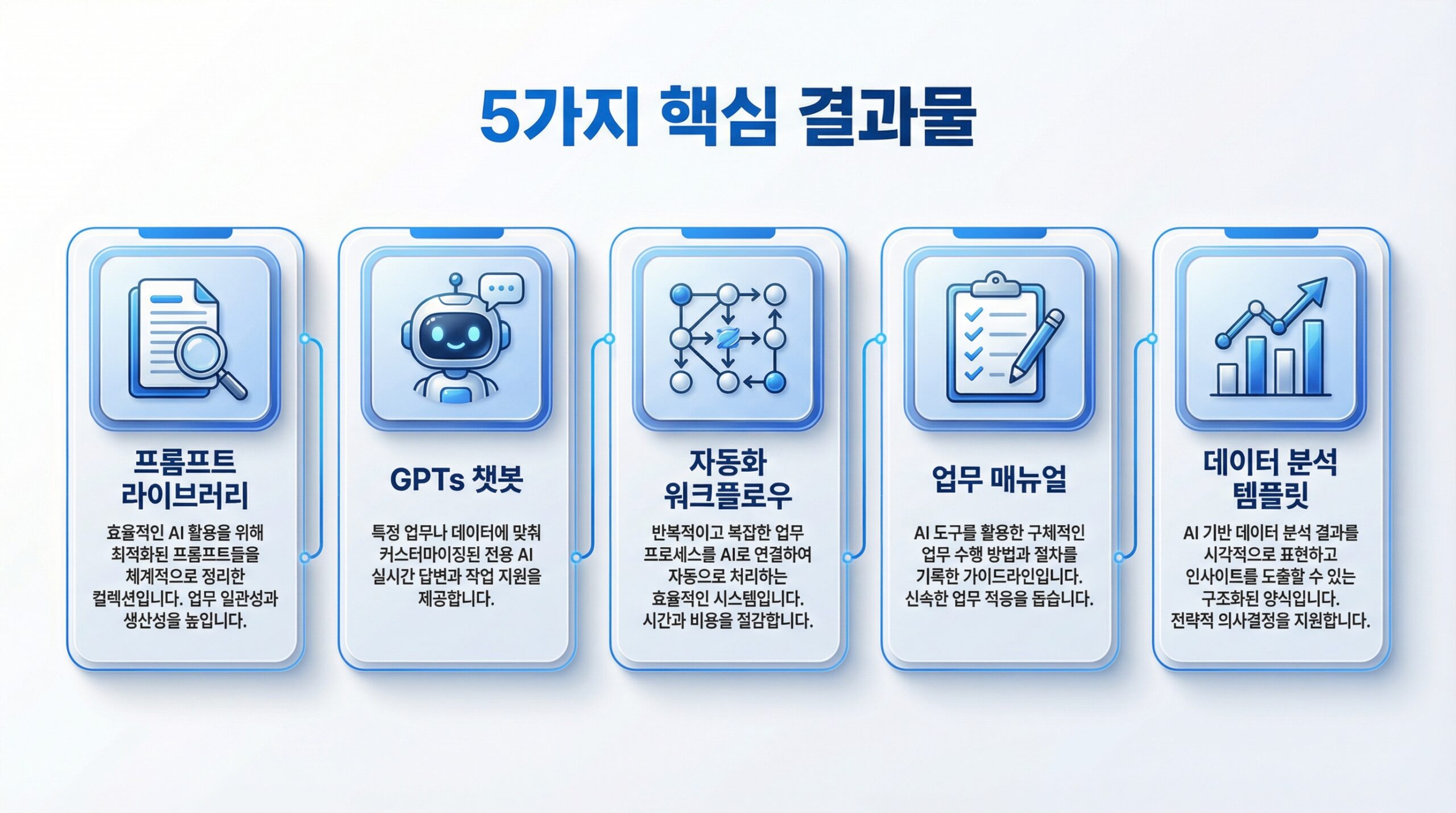 AI활용교육이 효과적으로 진행되면 교육 종료 시점에 다음 5가지 유형의 결과물을 얻을 수 있습니다. 각 결과물은 교육 후 즉시 업무에 적용 가능합니다.