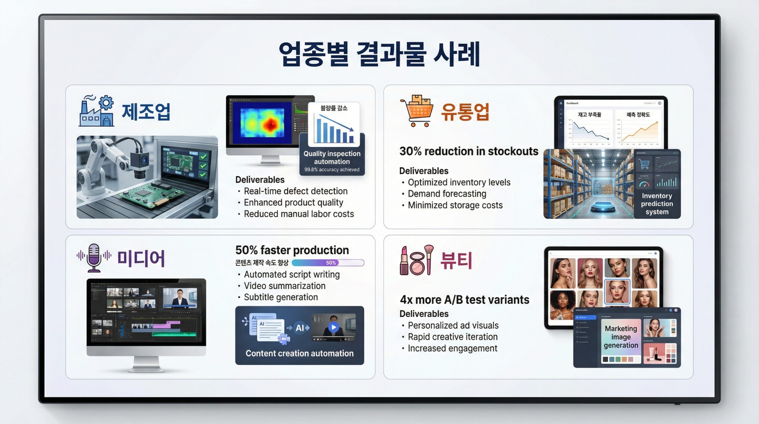 업종별로 AI활용교육의 결과물은 달라집니다. 실제 기업 사례를 통해 각 업종에서 어떤 산출물이 나왔는지 확인하세요.