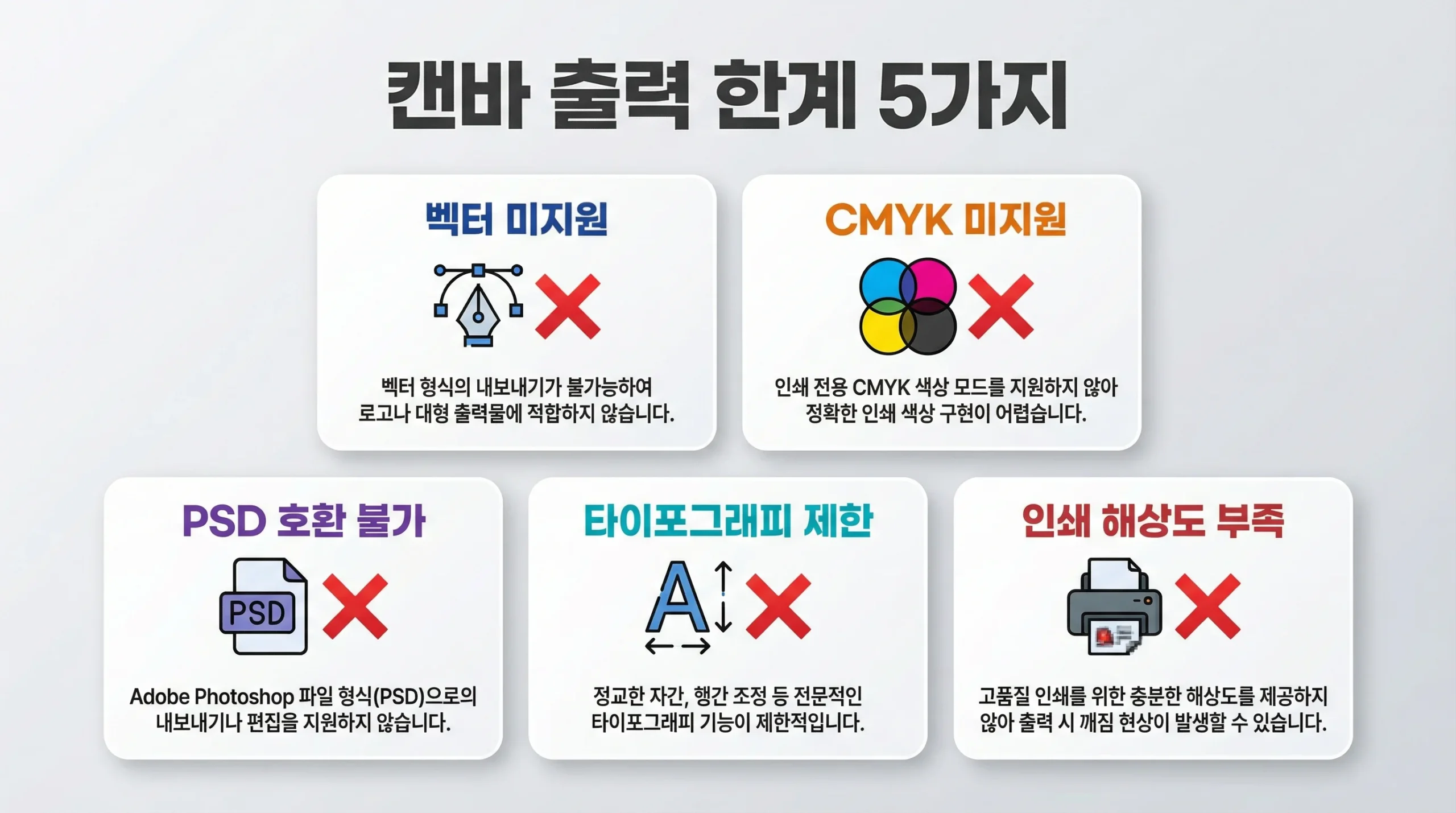캔바는 벡터 그래픽 편집, CMYK 색상 모드, 정밀 타이포그래피, PSD 호환을 지원하지 않습니다. Illustrator나 InDesign이 제공하는 전문 인쇄 품질과 세밀한 제어가 불가능합니다.