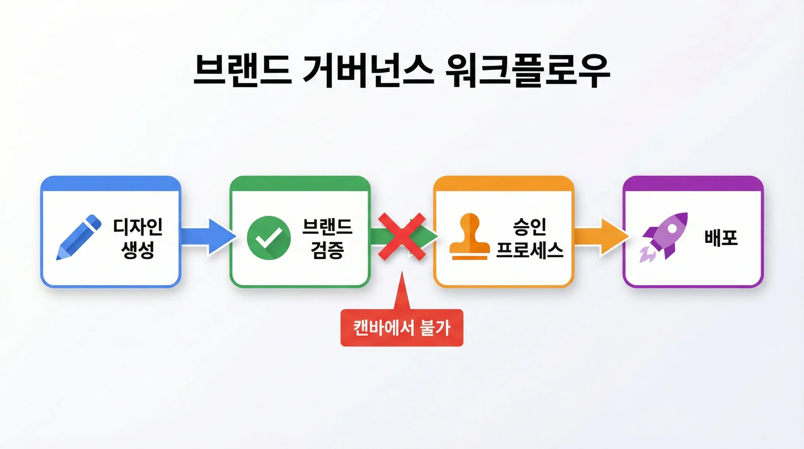 캔바 브랜드 키트는 “권장사항”일 뿐 “강제사항”이 아닙니다. 로고 배치 규칙, 여백 규정, 색상 조합 제한 같은 세부 가이드라인을 시스템 수준에서 적용할 수 없습니다. 다단계 승인 워크플로우(multi-level sign-off)도 지원하지 않아서, 디자인이 브랜드 가이드라인에 부합하는지 검수하는 과정이 전적으로 수작업에 의존합니다.