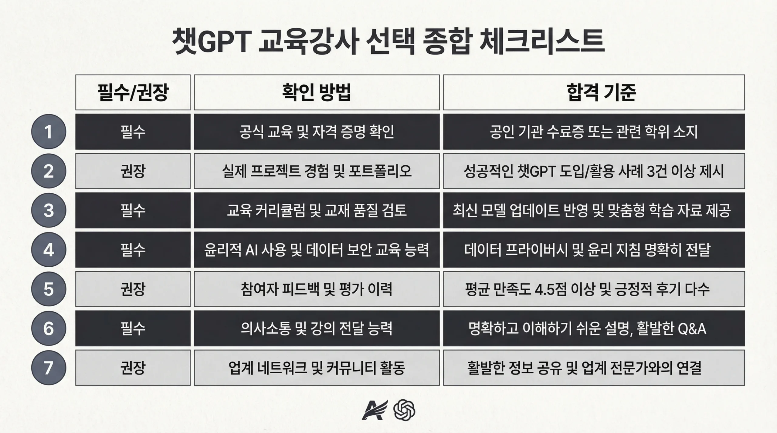 지금까지 살펴본 7가지 체크포인트를 하나의 표로 정리했습니다. 챗GPT 교육강사를 비교·평가할 때 이 표를 기준으로 활용하세요.