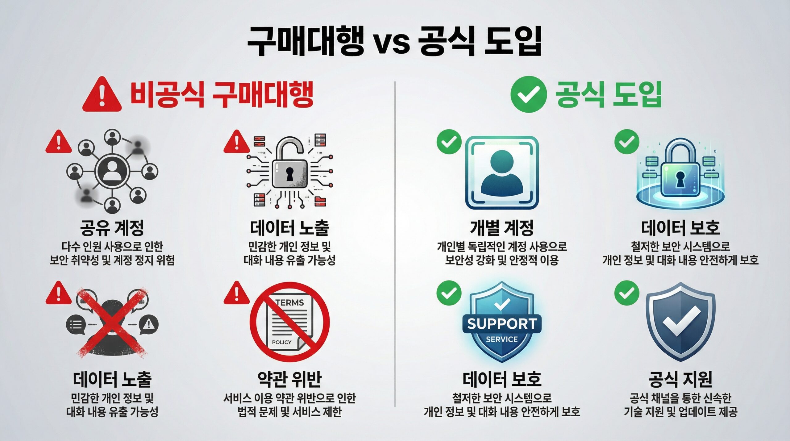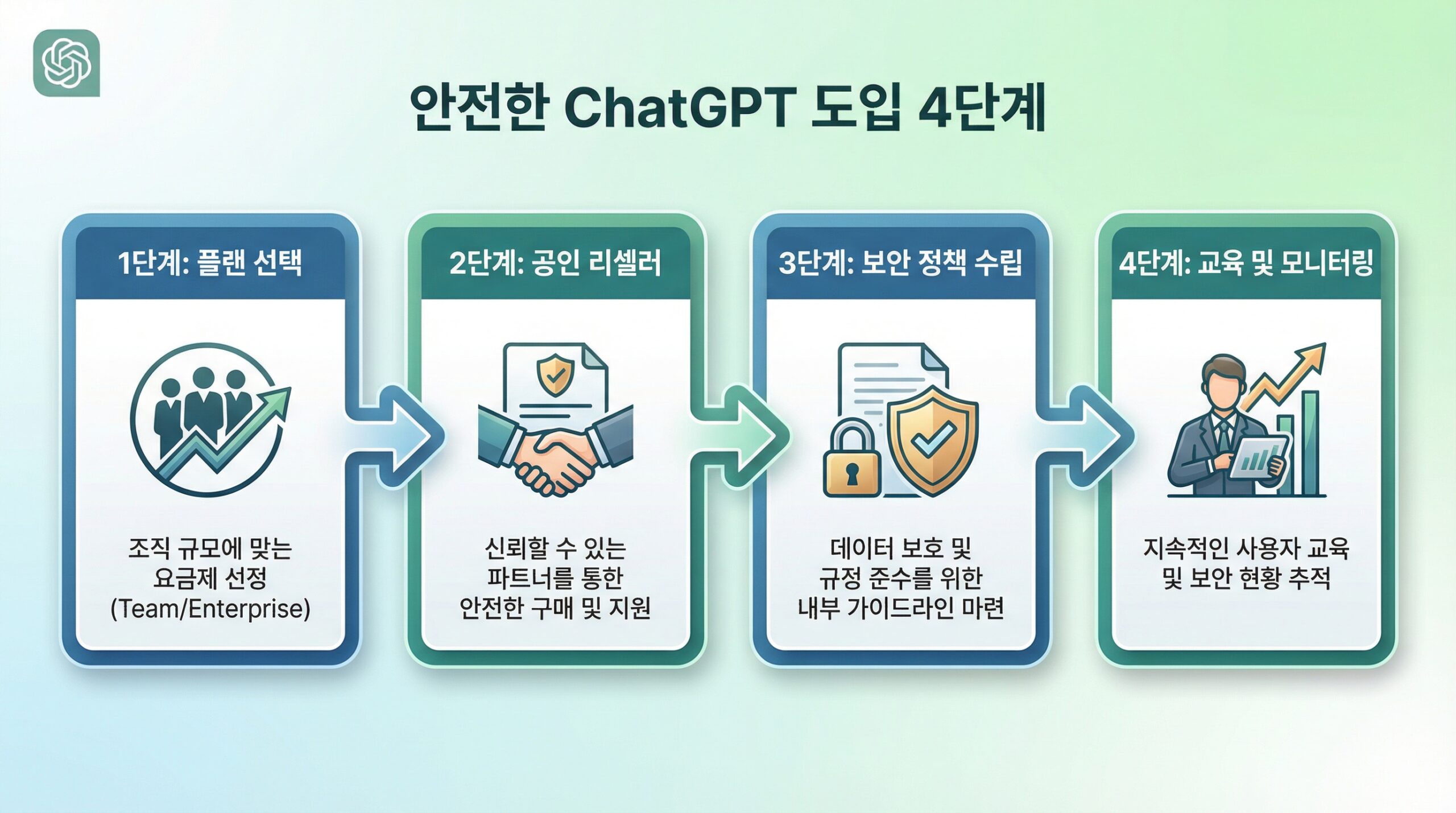 기업이 ChatGPT를 도입할 때는 반드시 공식 플랜(Team/Enterprise)을 공인 리셀러를 통해 구매하고, 내부 보안 정책을 수립한 뒤 직원 교육을 병행해야 합니다. 이것이 AI를 안전하게 활용하면서도 업무 생산성을 높이는 유일한 방법입니다.