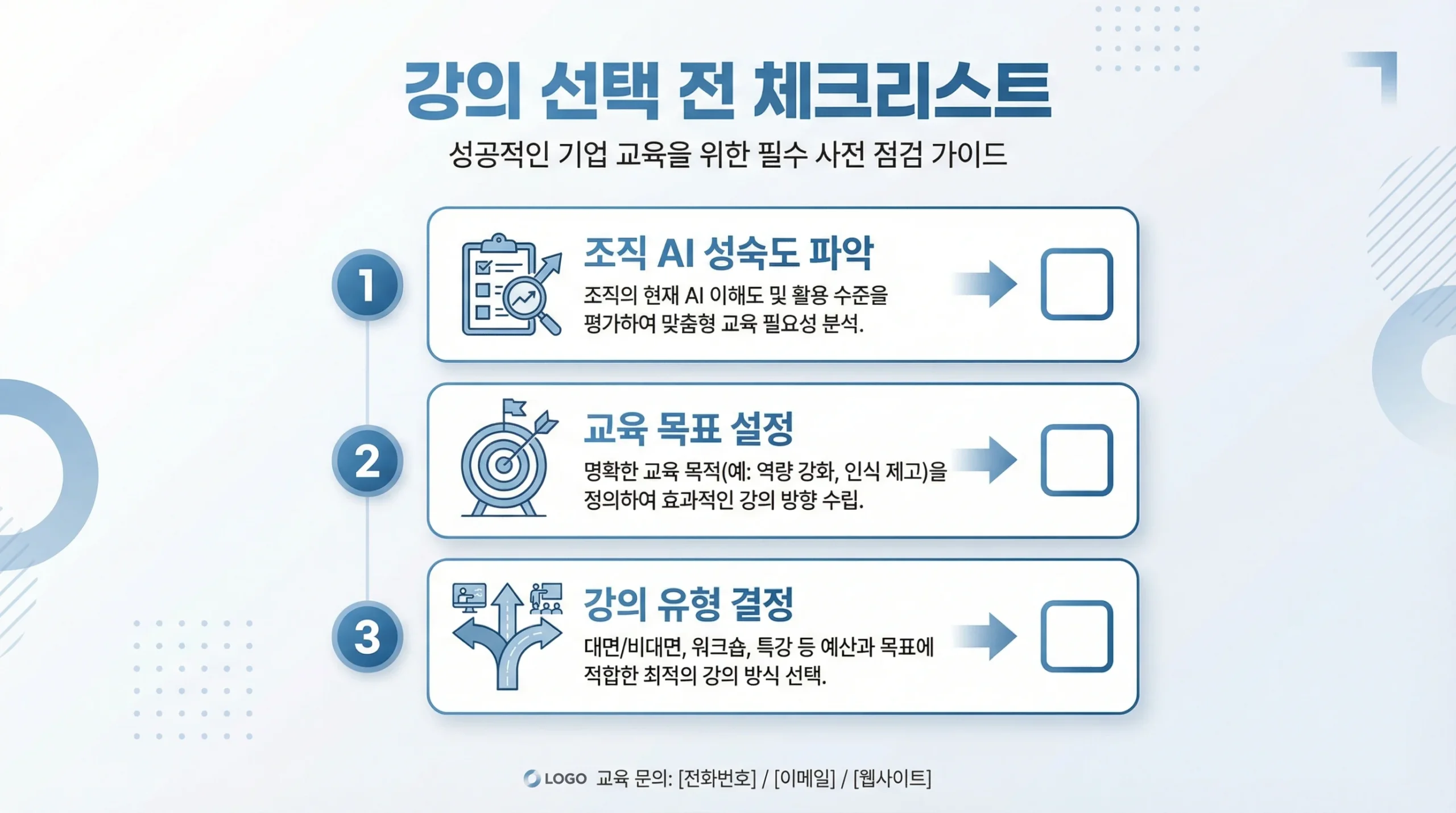 조직 상황에 따라 최적의 교육 경로가 달라집니다. 다음 단계를 순서대로 따라가면 불필요한 시행착오를 줄일 수 있습니다.