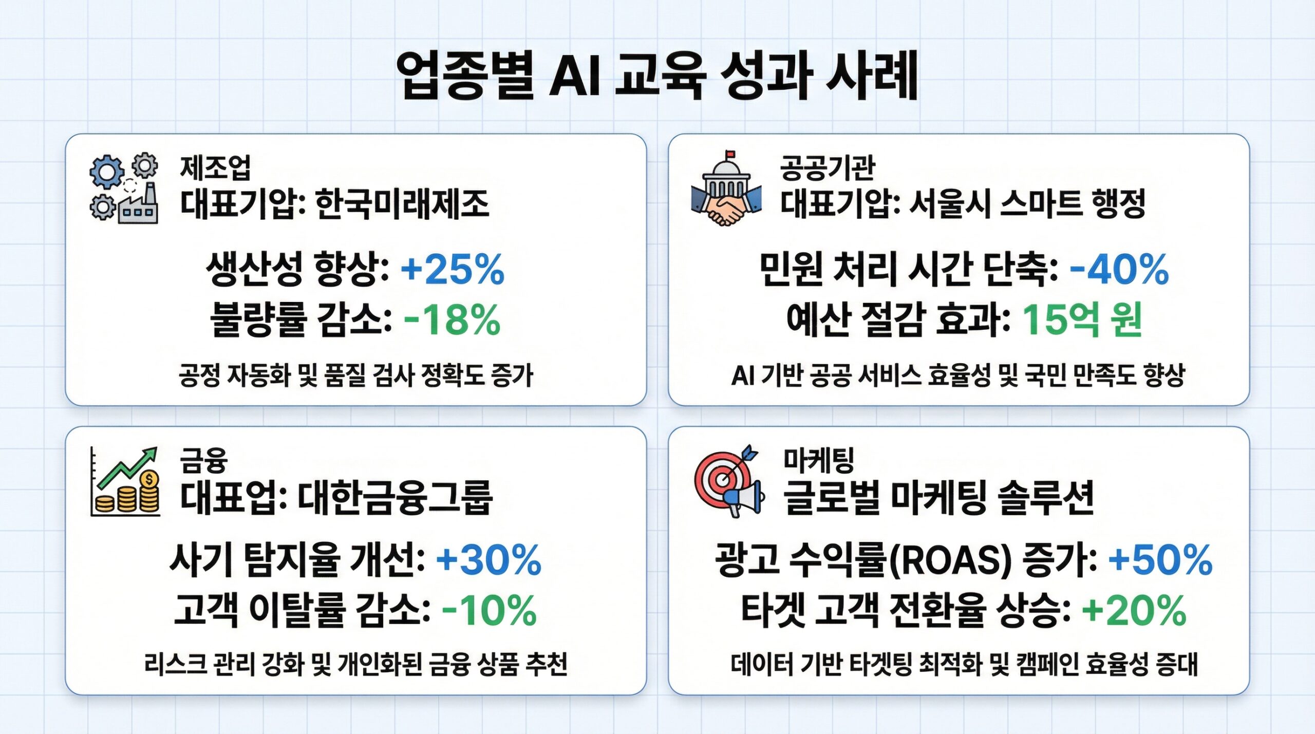 실제 코스피 상장사 H기업의 제조업 AI 리터러시 교육 사례를 포함해, 다양한 업종에서 성과가 입증되었습니다.