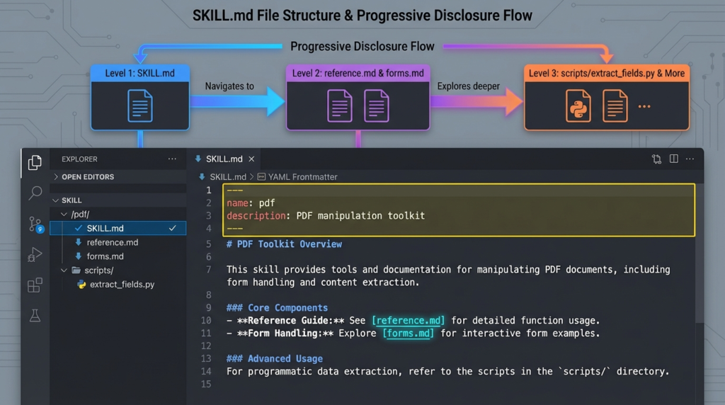 Anthropic 엔지니어링 블로그에 따르면, Skills는 Progressive Disclosure(점진적 공개) 원칙을 적용한다: