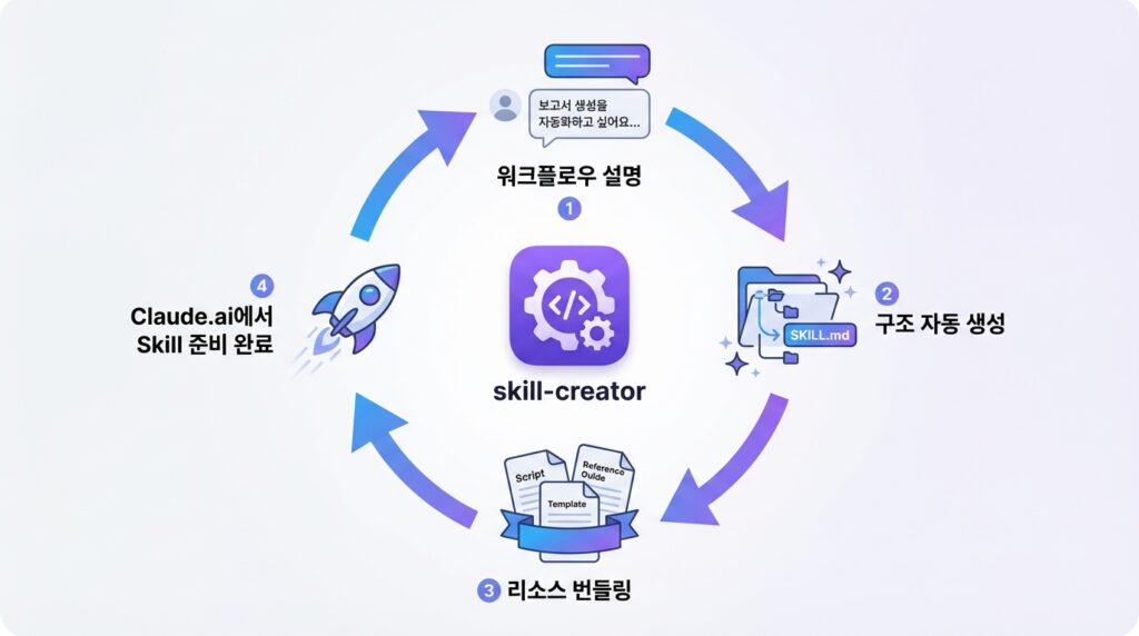 지금까지 살펴본 기본 Skills 외에, 조직 특화 워크플로우를 패키징하는 커스텀 Skills 제작이 가능하다. Anthropic은 “skill-creator”라는 메타 Skill을 제공하여 이 과정을 단순화했다.