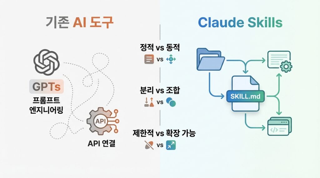 Skills의 핵심 개념을 이해하려면 기존 AI 도구 확장 방식과의 차이를 파악해야 한다. ChatGPT의 GPTs는 프롬프트 엔지니어링 기반이고, MCP(Model Context Protocol)는 외부 API 연동에 초점을 맞춘다. 반면 Skills는 폴더 기반 지시문 주입 방식으로, 절차적 지식과 조직 맥락을 Claude에 전달한다.