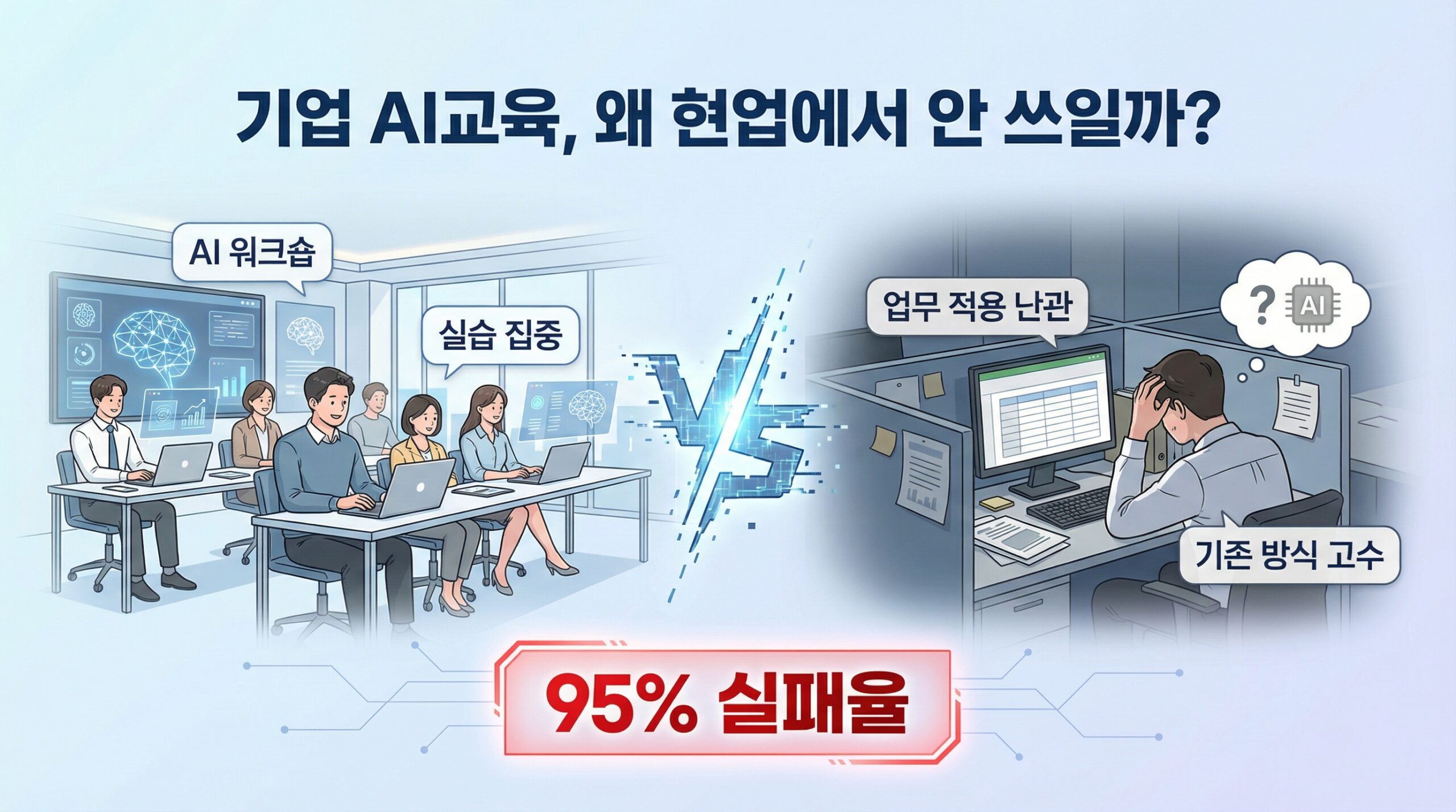 교육 내용이 범용적이고 실제 업무 맥락과 연결되지 않기 때문입니다. MIT 연구에 따르면 AI 프로젝트의 95%가 측정 가능한 성과를 내지 못하며, 핵심 원인은 기술이 아닌 조직 통합과 현업 USE-CASE 부재입니다.