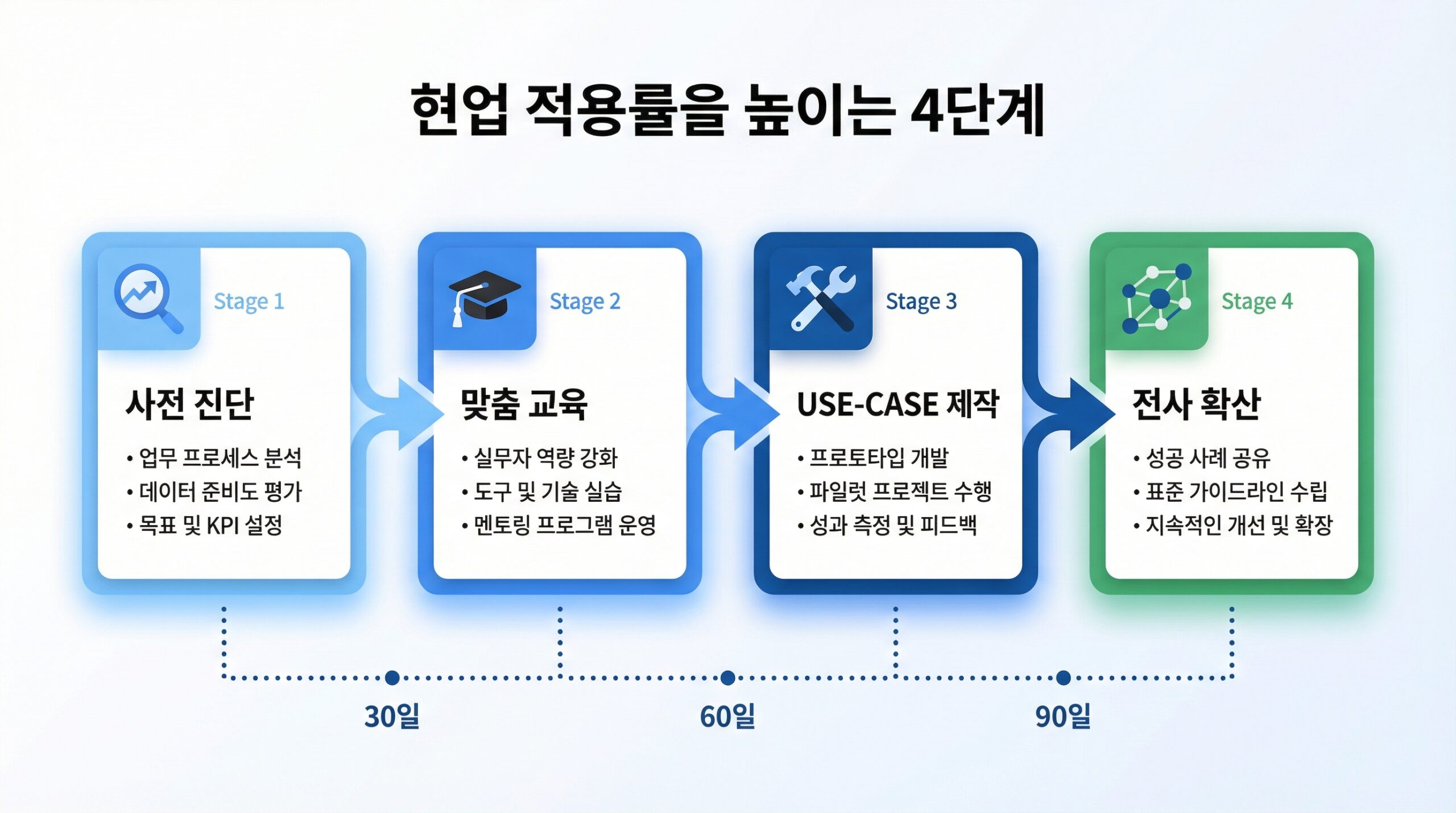 한 팀의 성공 사례가 다른 팀으로 확산되어야 진정한 AI 전환(AX)이 이루어집니다. 교육 후 30일 시점에 USE-CASE 발표회를 열고, 60일 시점에 활용 성과를 공유하며, 90일 시점에 전사 확대 여부를 결정합니다.