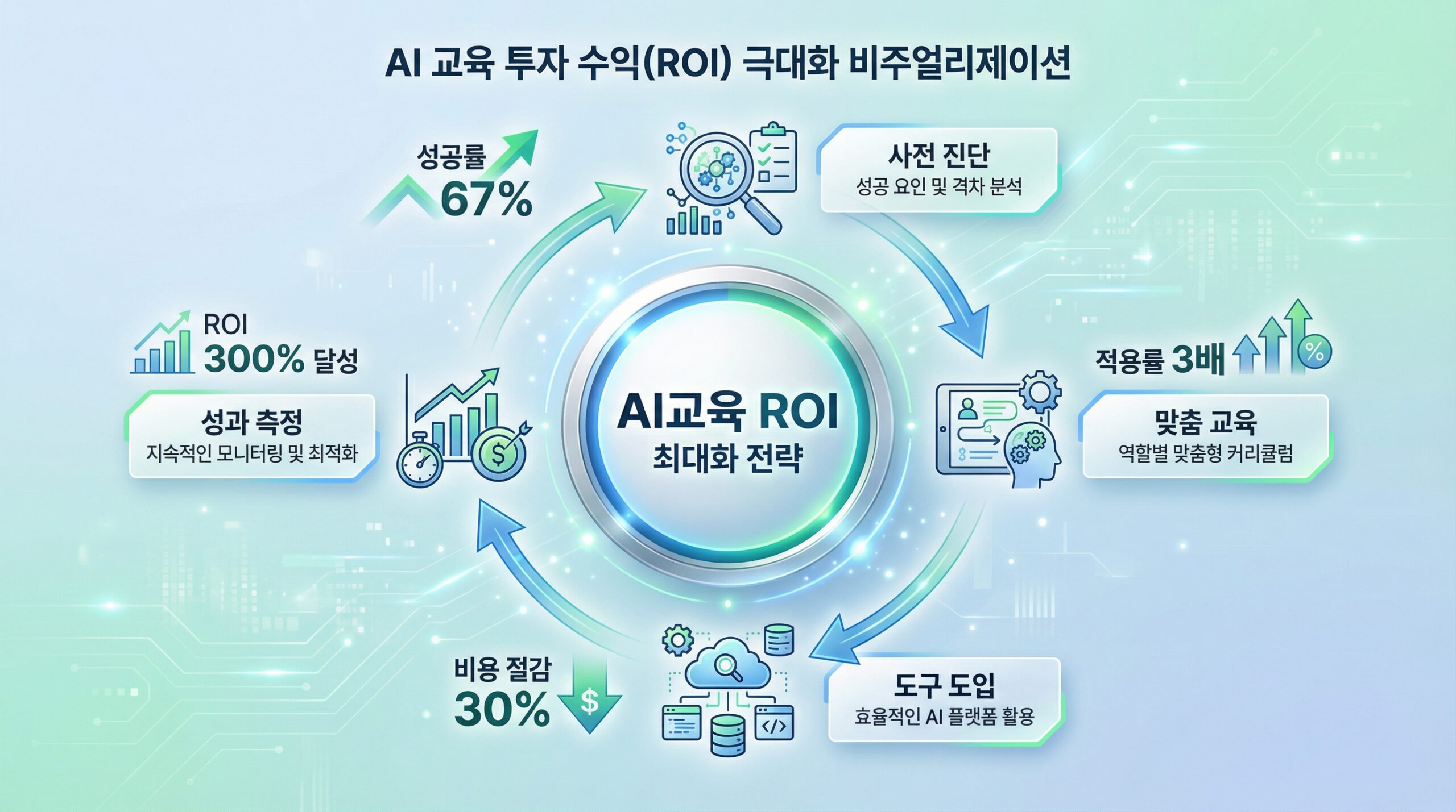 한국표준협회가 발간한 HRD Next: 기업교육 트렌드 2026 보고서는 AI교육이 “기술 이해 교육”에서 “현업 문제 해결 교육”으로 전환되어야 한다고 강조합니다. 투자 대비 효과를 극대화하기 위한 핵심 전략은 다음과 같습니다.