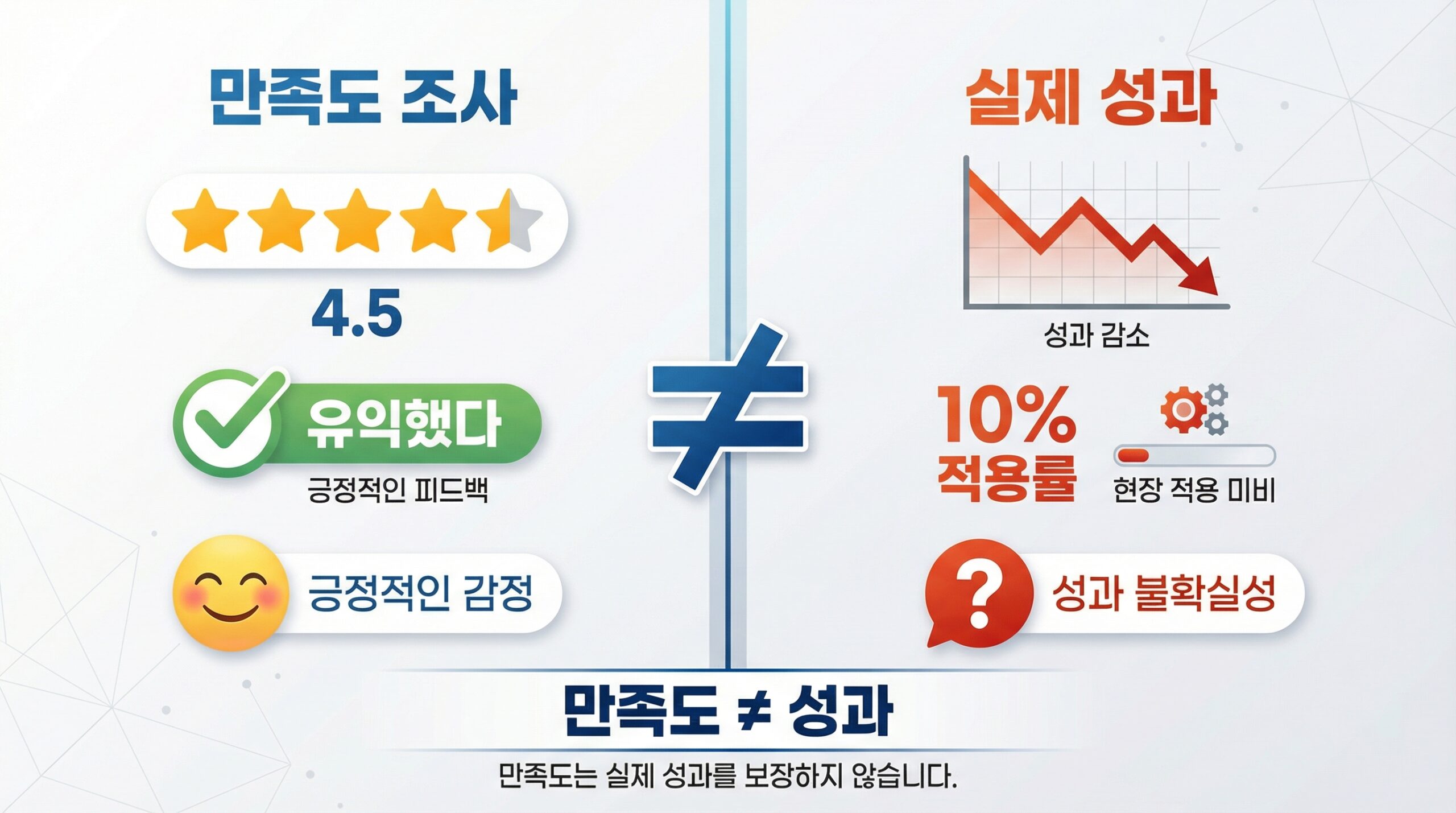 교육 만족도 조사는 본질적으로 감정적 반응을 측정합니다. 강사가 재미있었는지, 교육 환경이 쾌적했는지, 내용이 이해하기 쉬웠는지 같은 요소들입니다. 그러나 이러한 요소들이 실제 업무 성과와 직결되지는 않습니다.