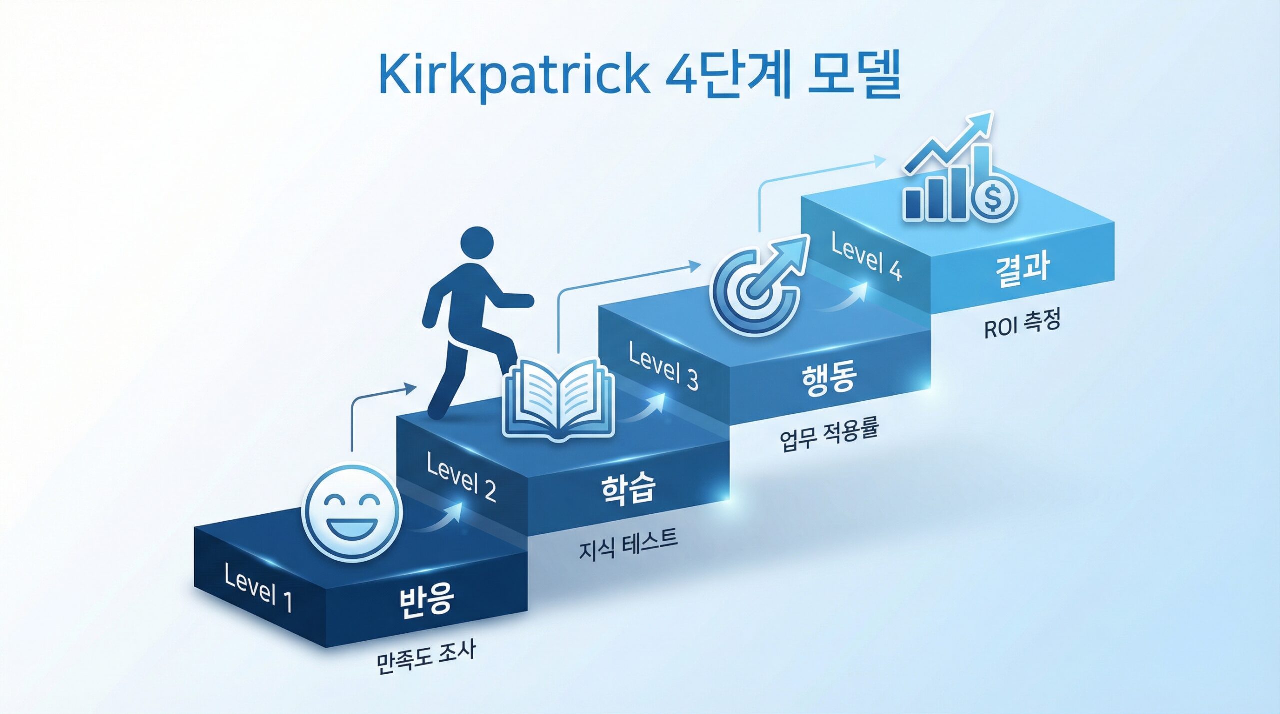 교육 성과를 체계적으로 측정하려면 Donald Kirkpatrick이 1959년에 개발한 4단계 평가 모델을 활용해야 합니다. 이 모델은 60년 이상 전 세계 기업, 정부, 학계에서 가장 널리 사용되는 교육 평가 프레임워크입니다.