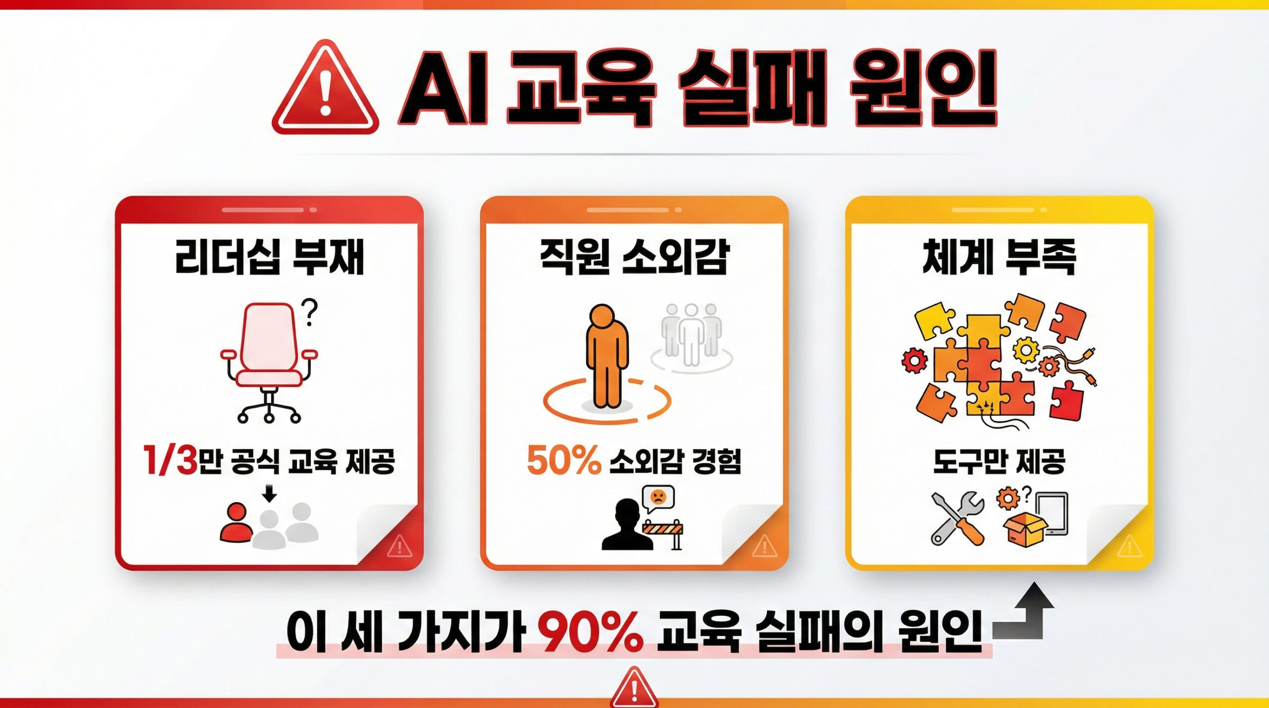 기업 AI 교육이 실패하는 원인은 대부분 교육 콘텐츠의 문제가 아닙니다. 리더십, 조직 문화, 시스템의 문제입니다.