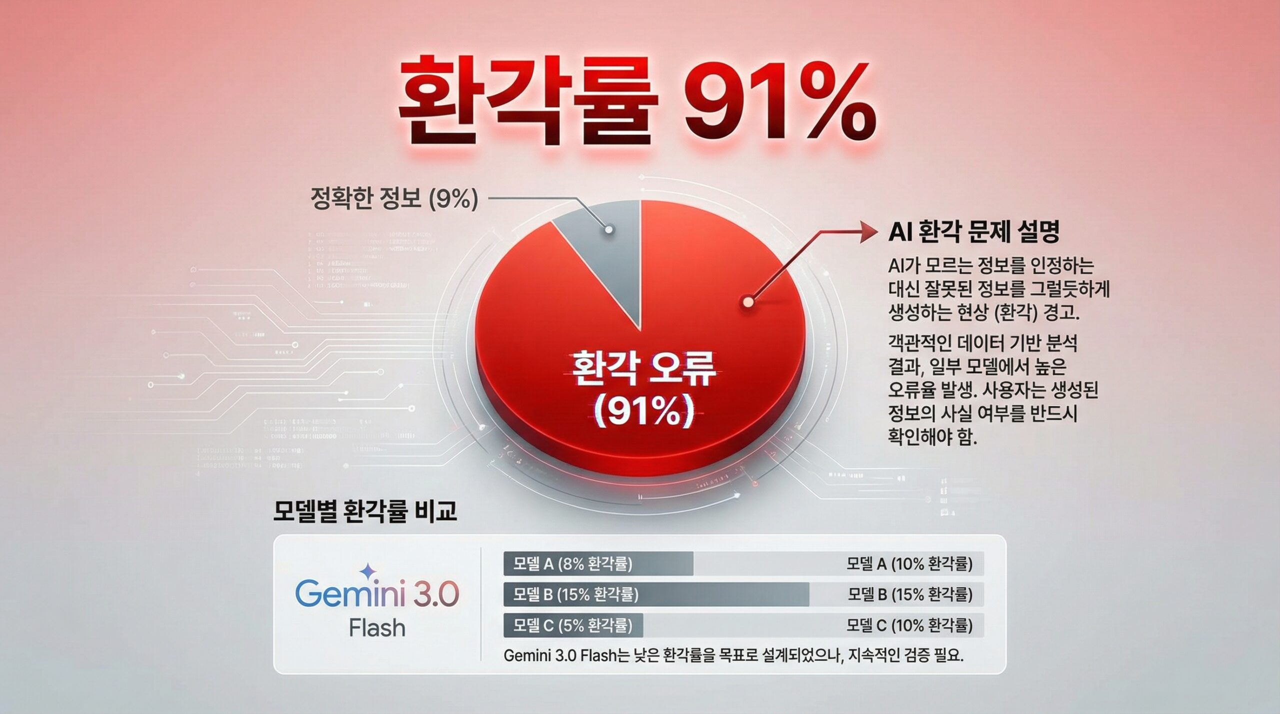 2025년 12월, 제미나이3 플래시의 환각률(hallucination rate)이 91%에 달한다는 분석이 공개되면서 신뢰성 논란이 불거졌습니다. 이 수치가 의미하는 바를 정확히 이해해야 합니다.