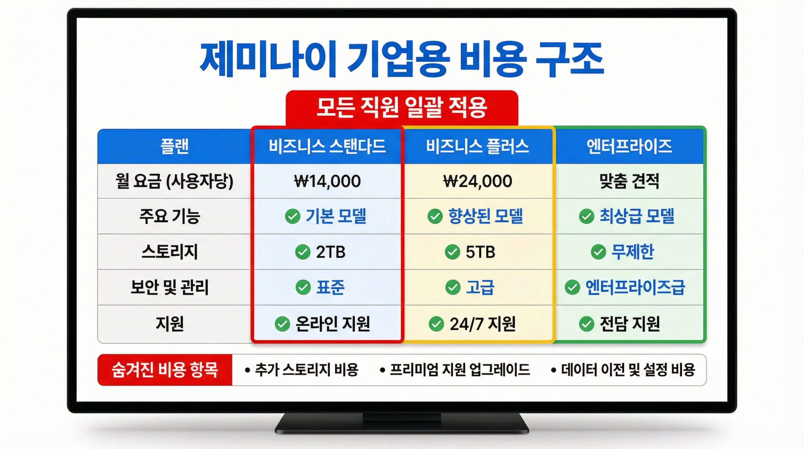 2025년 3월부터 Gemini 기능이 Workspace에 기본 포함되면서 Business Standard는 월 $14, Enterprise는 월 $25로 인상되었습니다. 별도 부가기능 구매가 불가능하여 전 직원 일괄 적용됩니다.