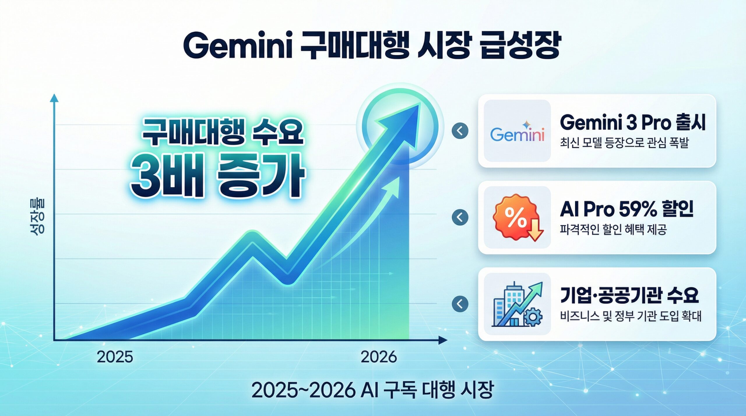 제미나이 구매대행 수요가 전년 대비 3배 이상 급증하고 있습니다. Google이 Gemini 3 Pro를 출시하고 AI Pro 요금제를 59% 할인한 이후, 한국 기업과 공공기관의 도입 문의가 폭발적으로 증가했습니다. 그런데 왜 직접 구독하지 않고 구매대행을 찾을까요? 법인카드 해외 결제 제한, 세금계산서 발행 불가, 대량 계정 관리의 어려움까지 — 한국 기업 환경에서 해외 AI 서비스를 직접 구독하는 것은 생각보다 복잡합니다.