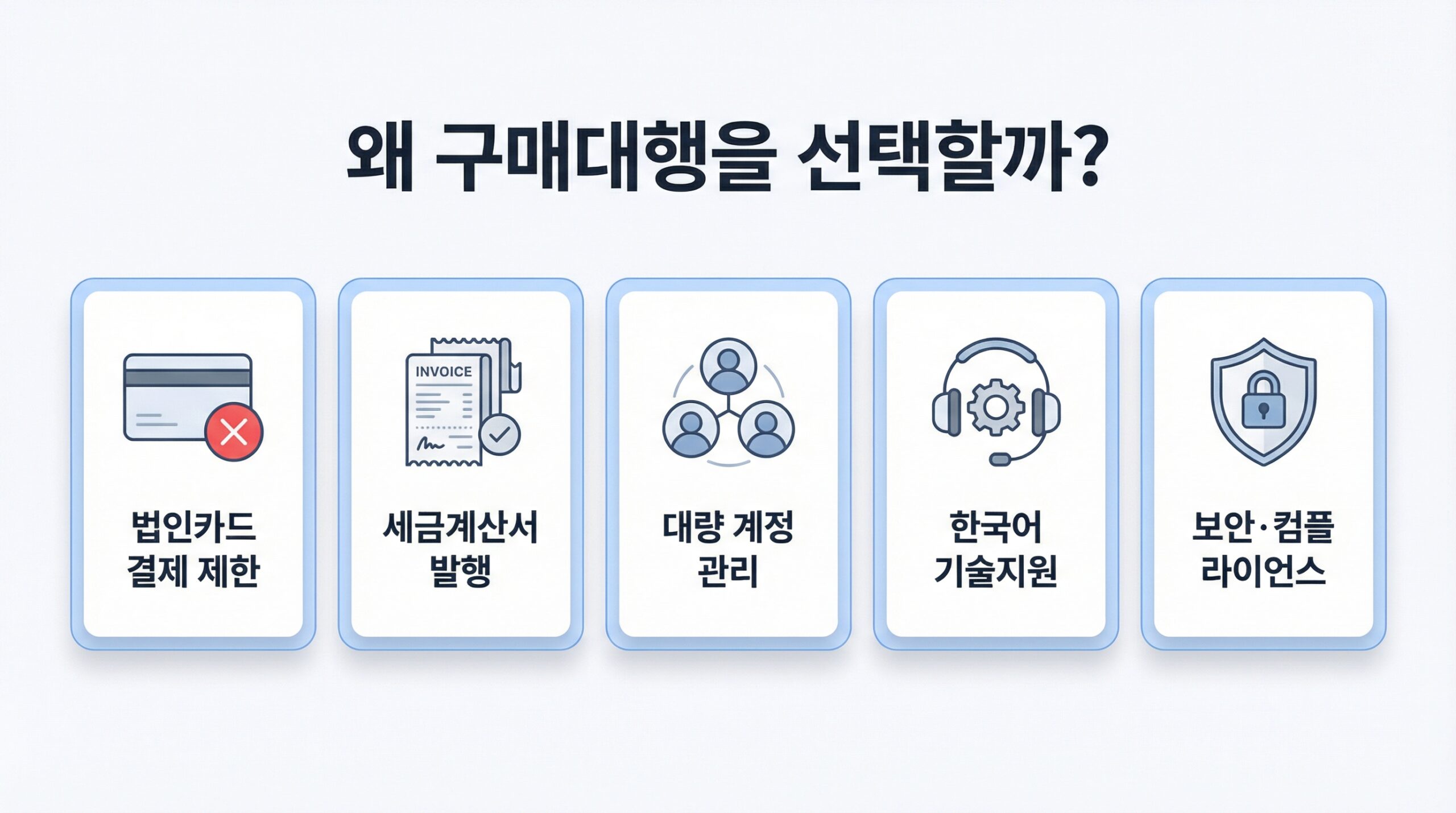 직접 구독은 개인 신용카드 결제와 영어 고객지원에 의존해야 합니다. 구매대행은 법인카드 및 계좌이체 결제, 한국어 기술지원, 세금계산서 발행, 계정 일괄 관리 등 기업 운영에 필요한 서비스를 추가로 제공합니다.