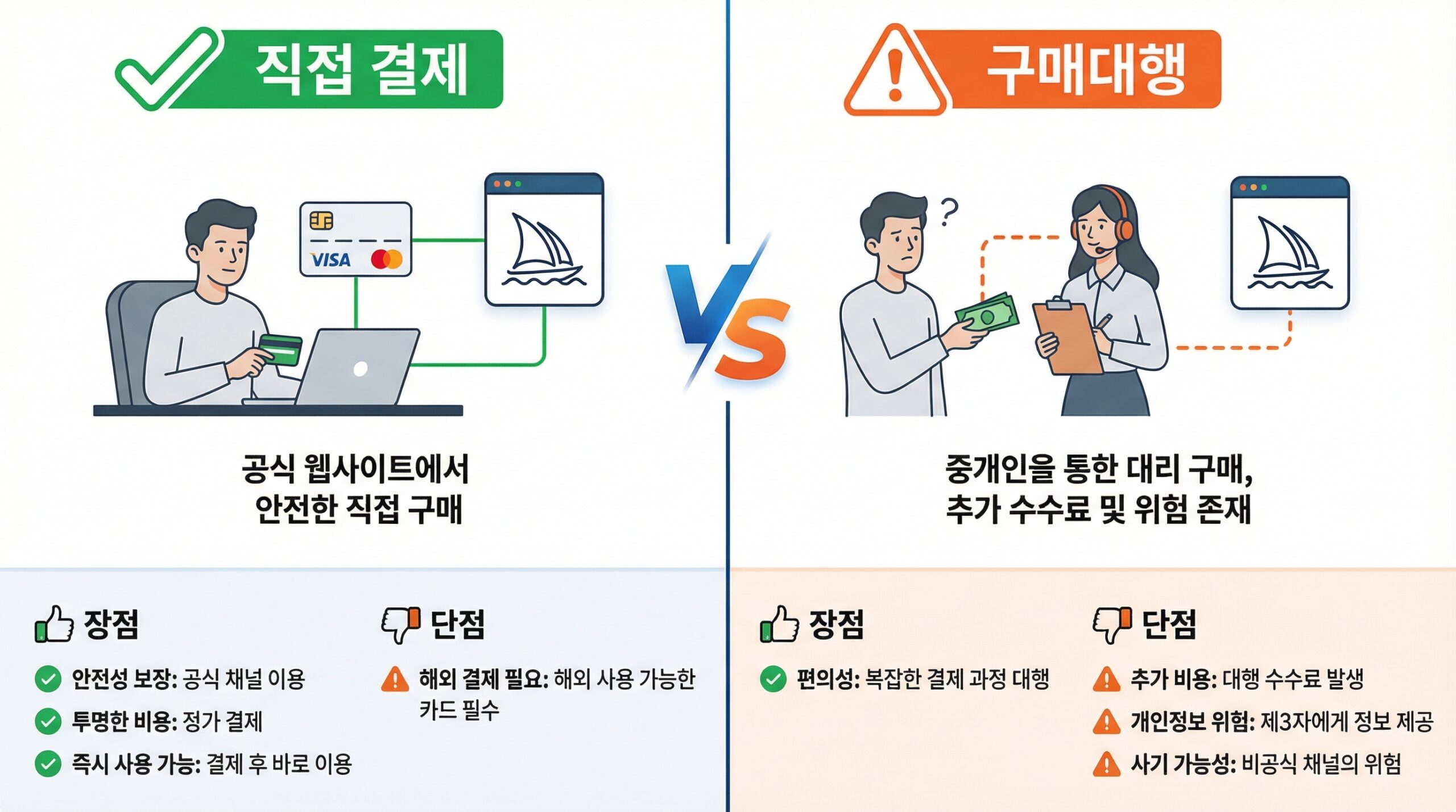직접 결제는 midjourney.com에서 본인 카드로 결제하는 방식이고, 구매대행은 제3자가 대신 결제해주는 서비스입니다. 구매대행은 계정 공유에 해당하여 이용약관 위반으로 계정 차단 위험이 있습니다.