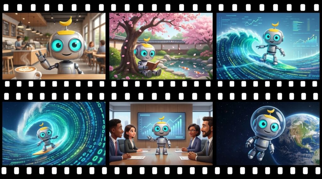 나노바나나가 주목받는 핵심 이유는 ‘캐릭터 일관성(Character Consistency)’ 문제의 해결이다. 기존 AI 이미지 모델들은 동일 캐릭터로 여러 이미지를 생성할 때 얼굴, 의상, 체형이 미묘하게 변하는 한계가 있었다. 나노바나나는 한번 생성된 캐릭터의 정체성을 거의 완벽하게 유지하며 다양한 포즈와 배경 연출이 가능하다.