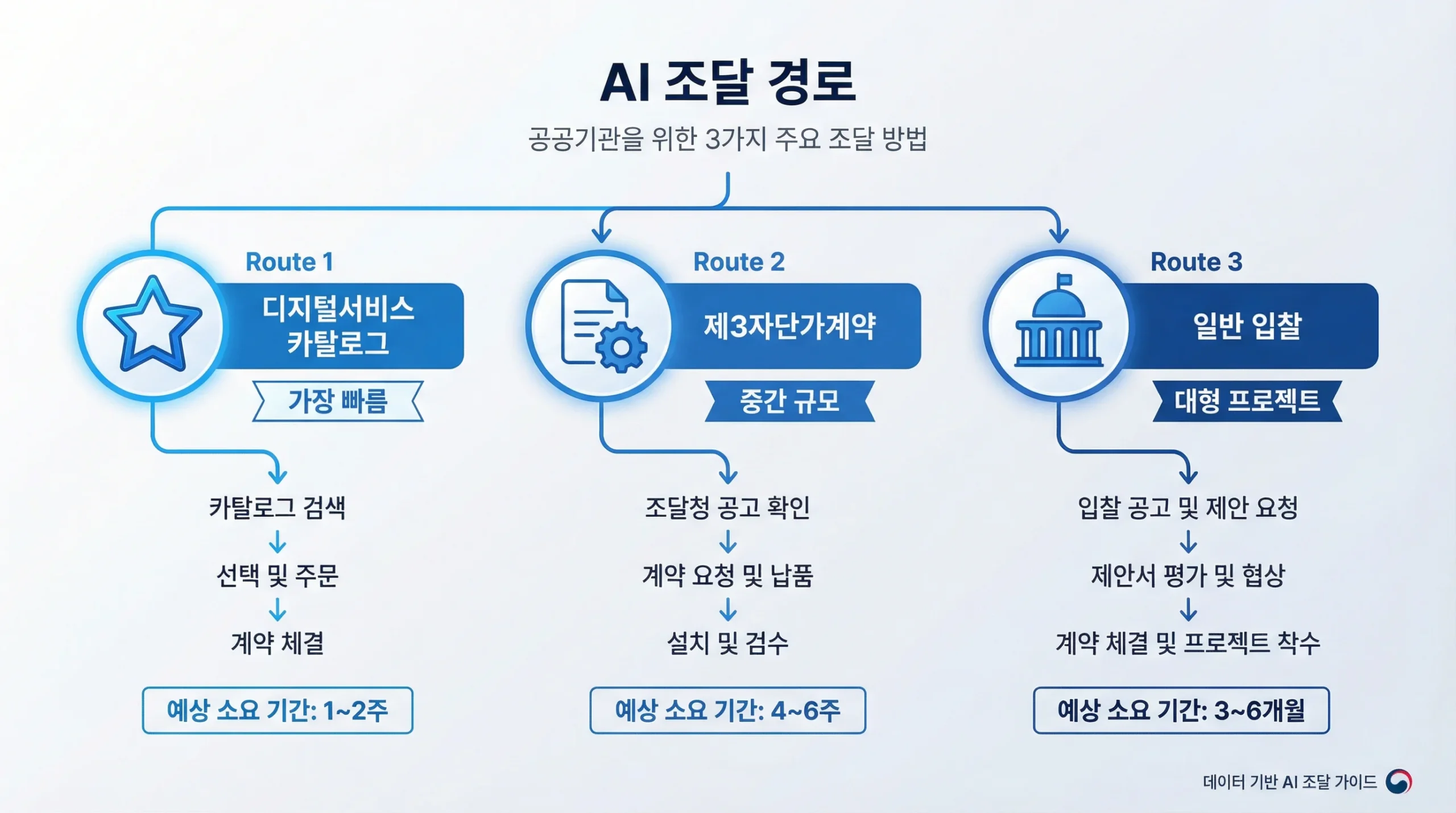 - 경로 선택: 예산 규모와 긴급성에 따라 디지털서비스 카탈로그, 제3자단가계약, 일반 입찰 중 선택합니다