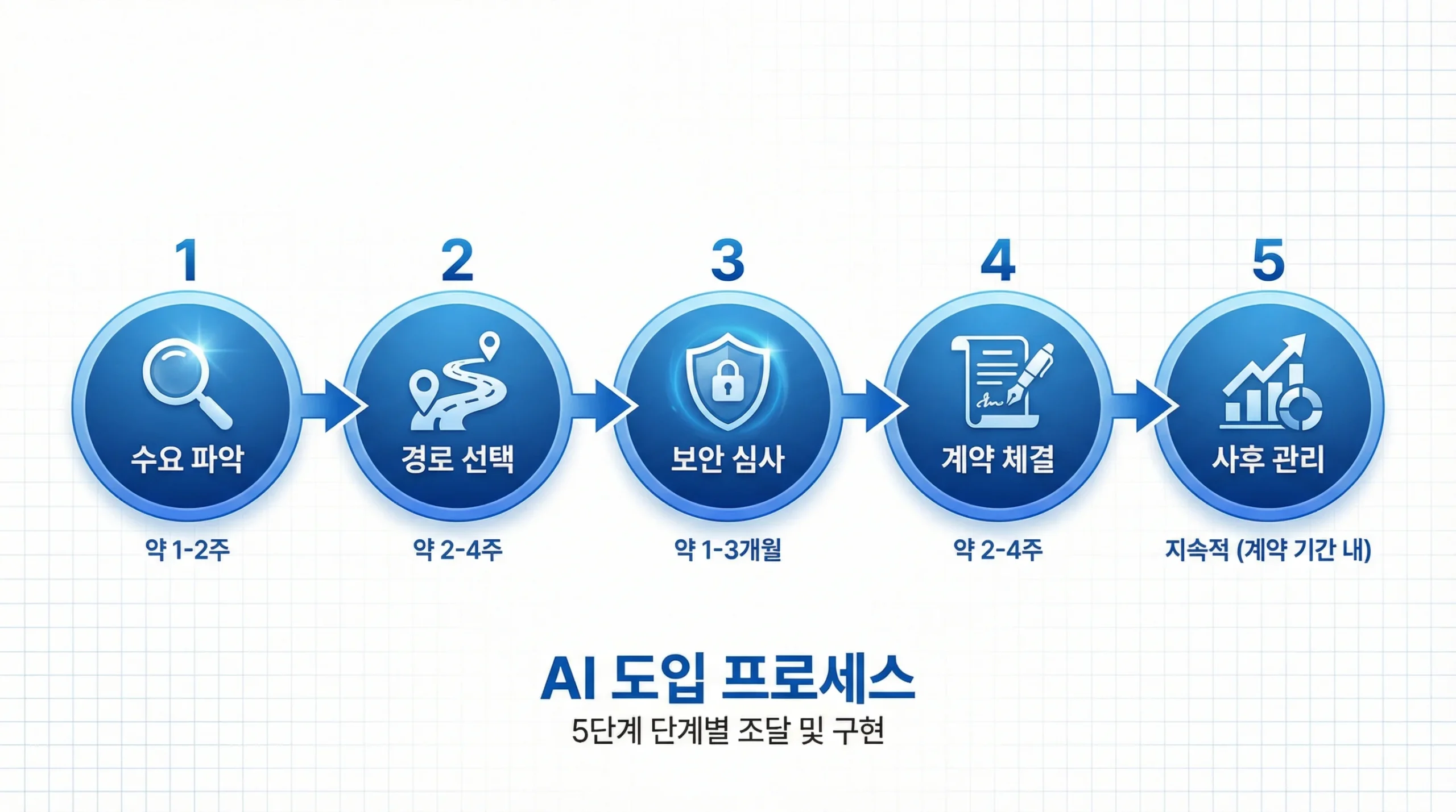 공공기관 AI 구매대행은 5단계로 진행됩니다. 각 단계에서 실무 담당자가 준비해야 할 사항을 구체적으로 안내합니다.