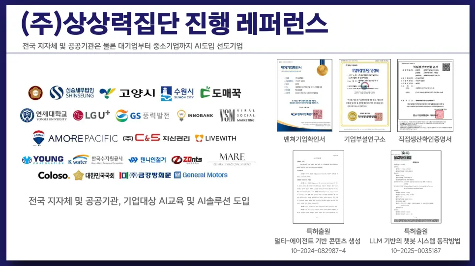 전사적 AI 도입 과정에서 파트너 선택 기준을 살펴본다. ㈜상상력집단은 2023년 설립 이후 통계청, 고용노동부, 서울주택도시공사, 인천시청, 완주군청, 국회의사당, 대전테크노파크, 국립소방연구원 등 300개 이상의 공공기관 및 기업에 AI 도입 서비스를 제공해왔다.