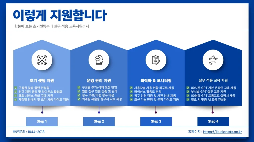 AI 구매대행 서비스의 핵심 가치는 계정 발급을 넘어선 초기 세팅, 운영 관리, 교육까지의 통합 지원이다.
