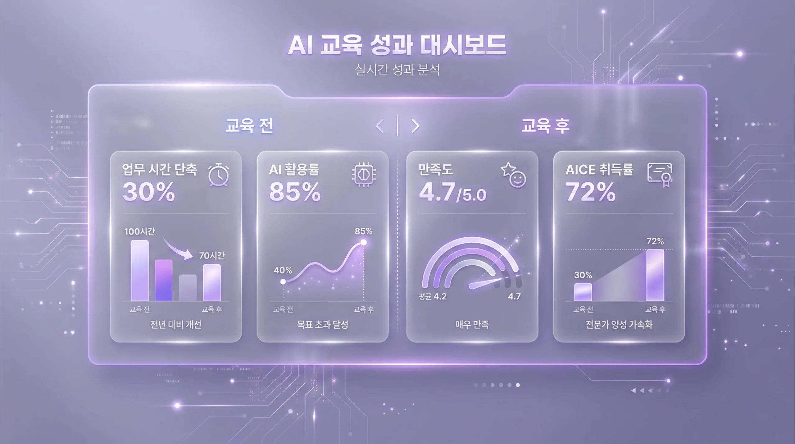 교육 전후 업무 소요 시간 비교, 실습 결과물 평가, 수료 후 3개월 이내 업무 적용률 추적 등 정량 지표를 활용합니다. AICE 같은 국가공인 자격시험 결과도 객관적 기준이 됩니다.